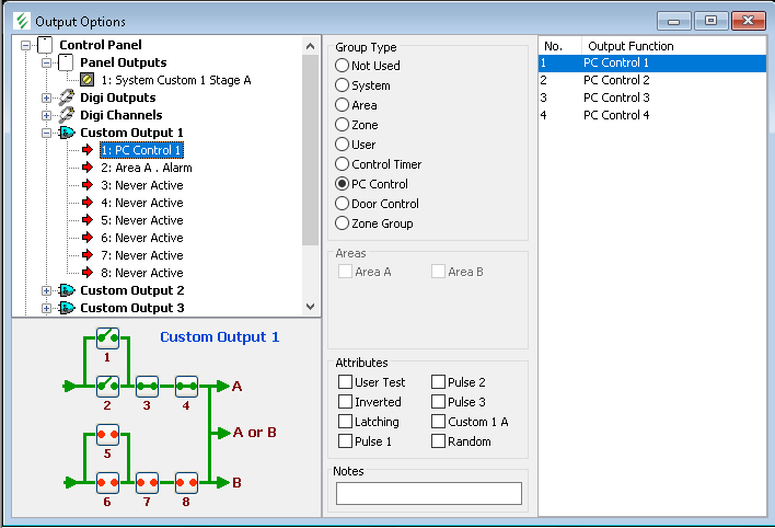 I have my (GJD) Floodlights wired up to the relay on the panel (output 5) and have set it such that in an Alarm condition they will turn on. However, I'd like to be able to also control this output (i.e. turn floodlights on/off) from the Mobile Connect App. I've worked out how to get PC Output 1 to fire from the app, and can assign this to Panel Output 5 however there seems to be only the ability (in Wintex software) to assign one or the other to the panel outputs, i.e. Area -> Alarm OR PC output -> Output 1 but not both.