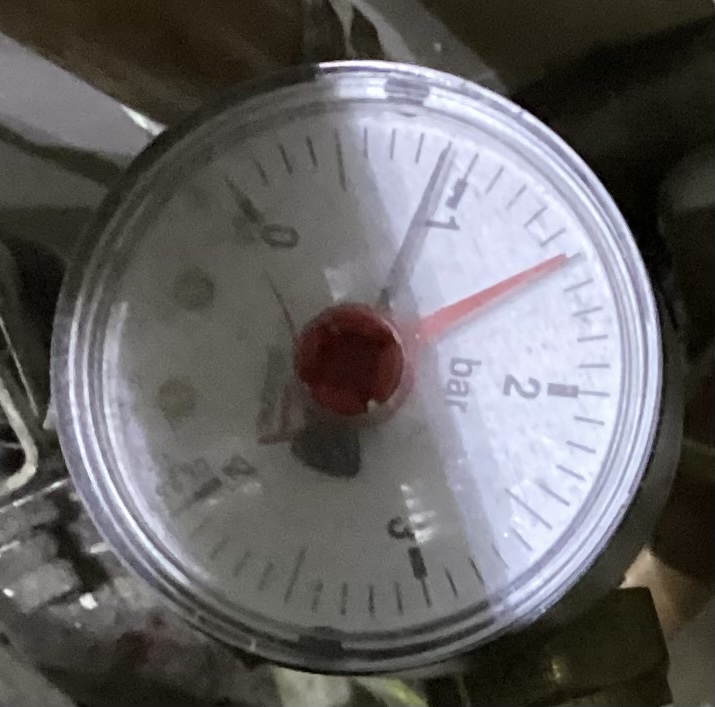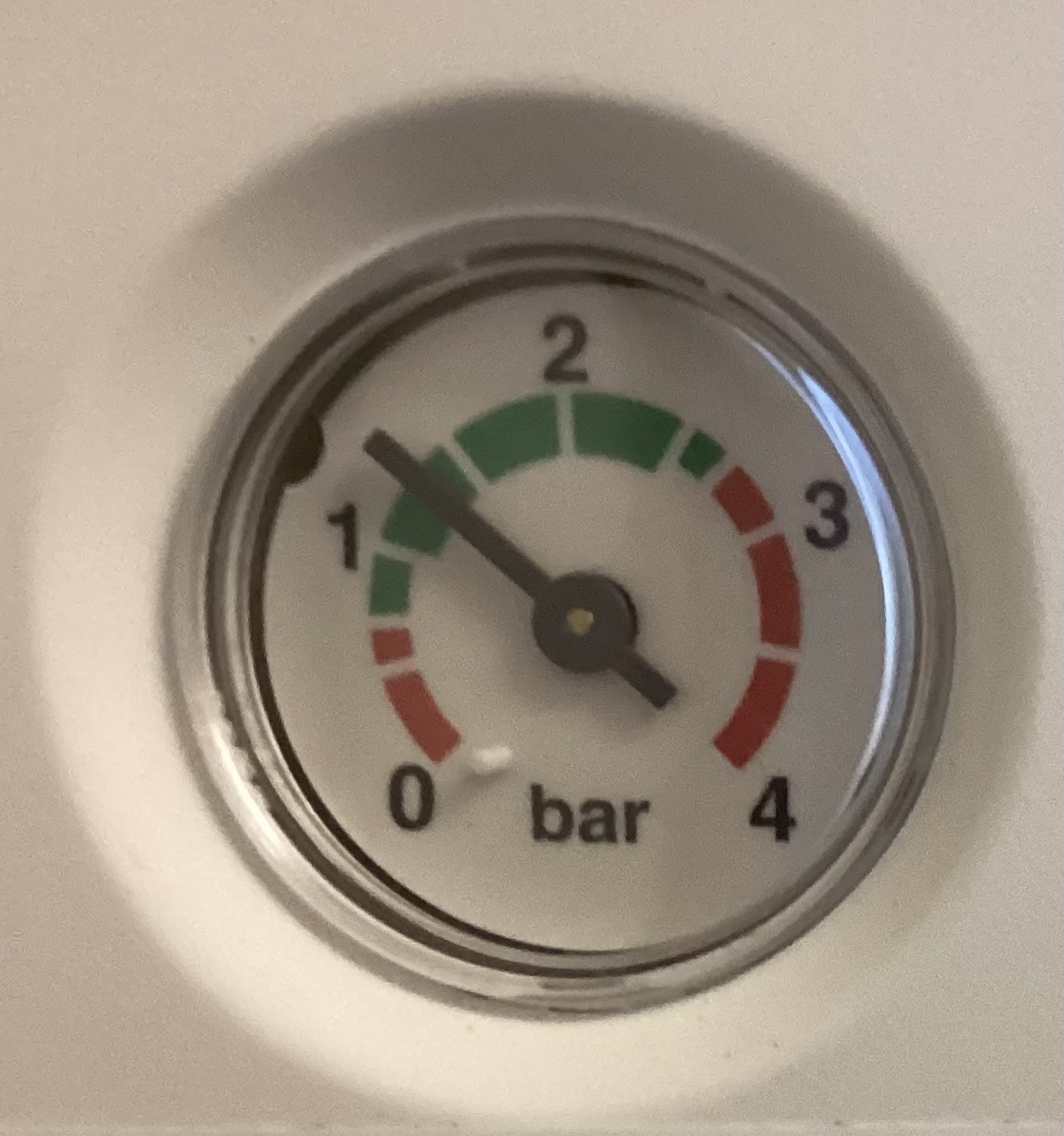 pressure meter on the boiler itself....shows an area of green and the indication is above 1 bar, and may not need touching