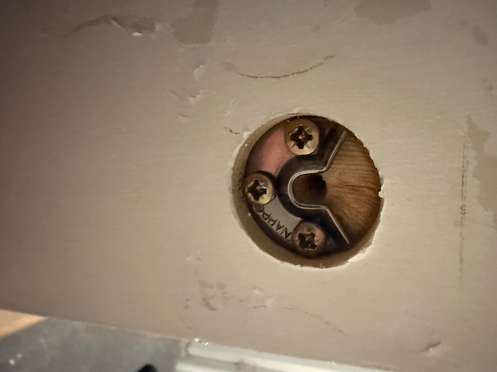 I am trying to fit a handrail with a recessed hook system on my landing. Once I lock in one end, the screw on the other end won’t clear the edge of the newell post to the centre of the post where the hook system is due to the protruding screw that needs to hook in - see photos.
