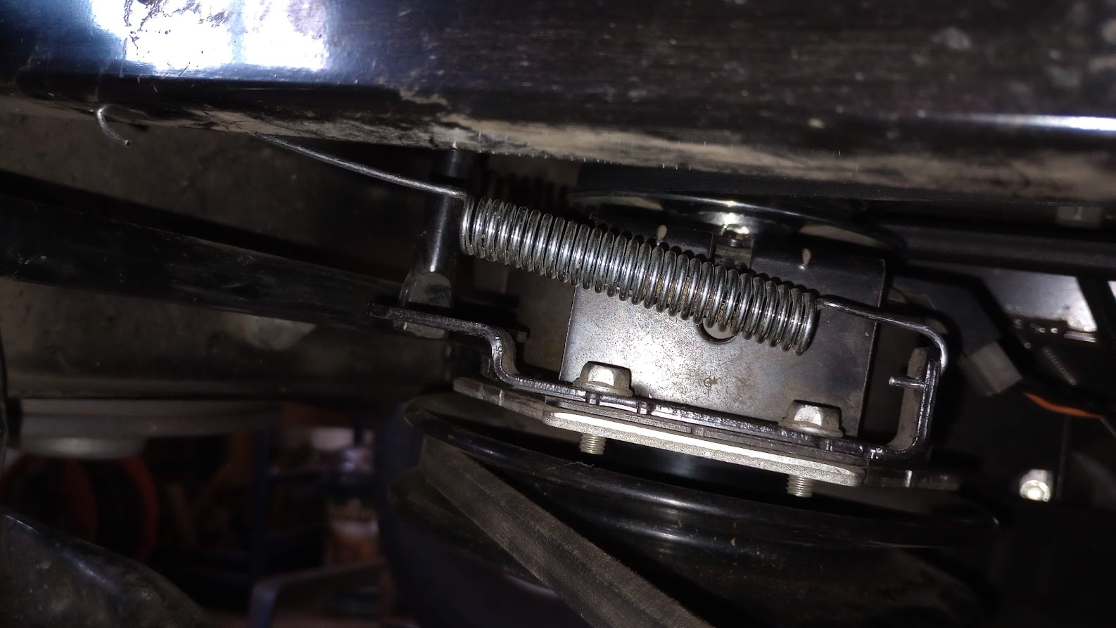 The only thought I had was that I might not have reinstalled the electromagnetic clutch correctly (having had to drop this down to get the transmission belt on). There is also a spring connected to the elecromagnetic clutch that fell off and it is possible that I reinstalled this incorrectly. I attach a photo showing how these parts look after I reinstalled them.