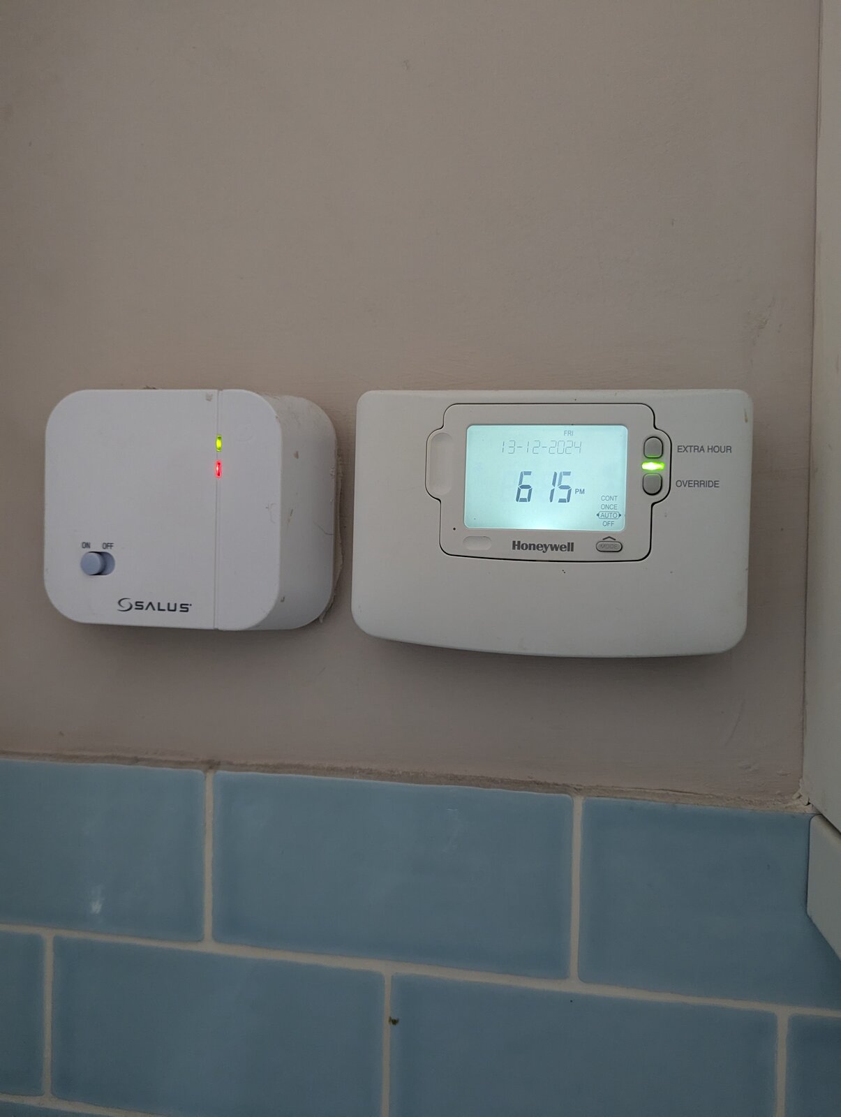 There is a Salus RF receiver next to the Honeywell programmer, and a wireless thermostat in the hallway.