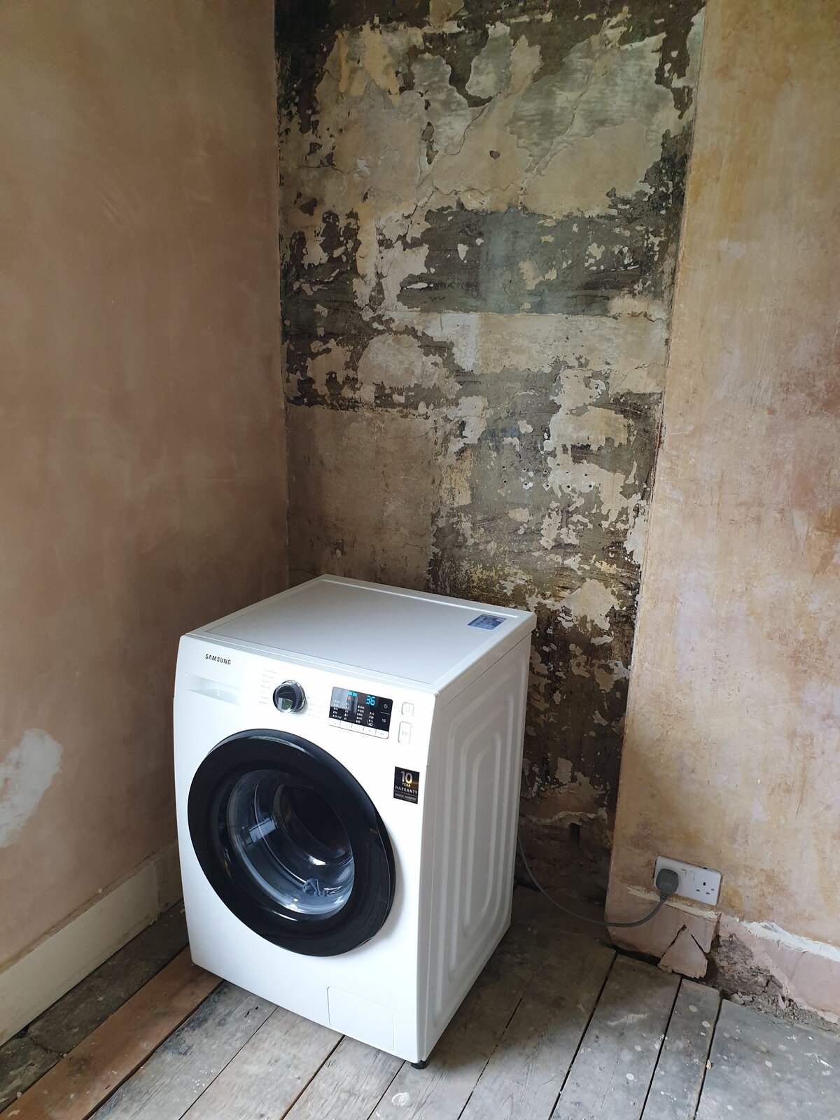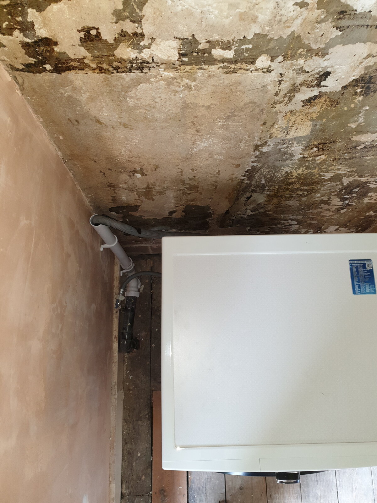 I will have the builders soon replacing floorboards with plywood and laying engineered wood on top. The washing machine will be concealed in a corner cupboard with a row of built-in Ikea Pax wardrobes right next to it along the wall.
