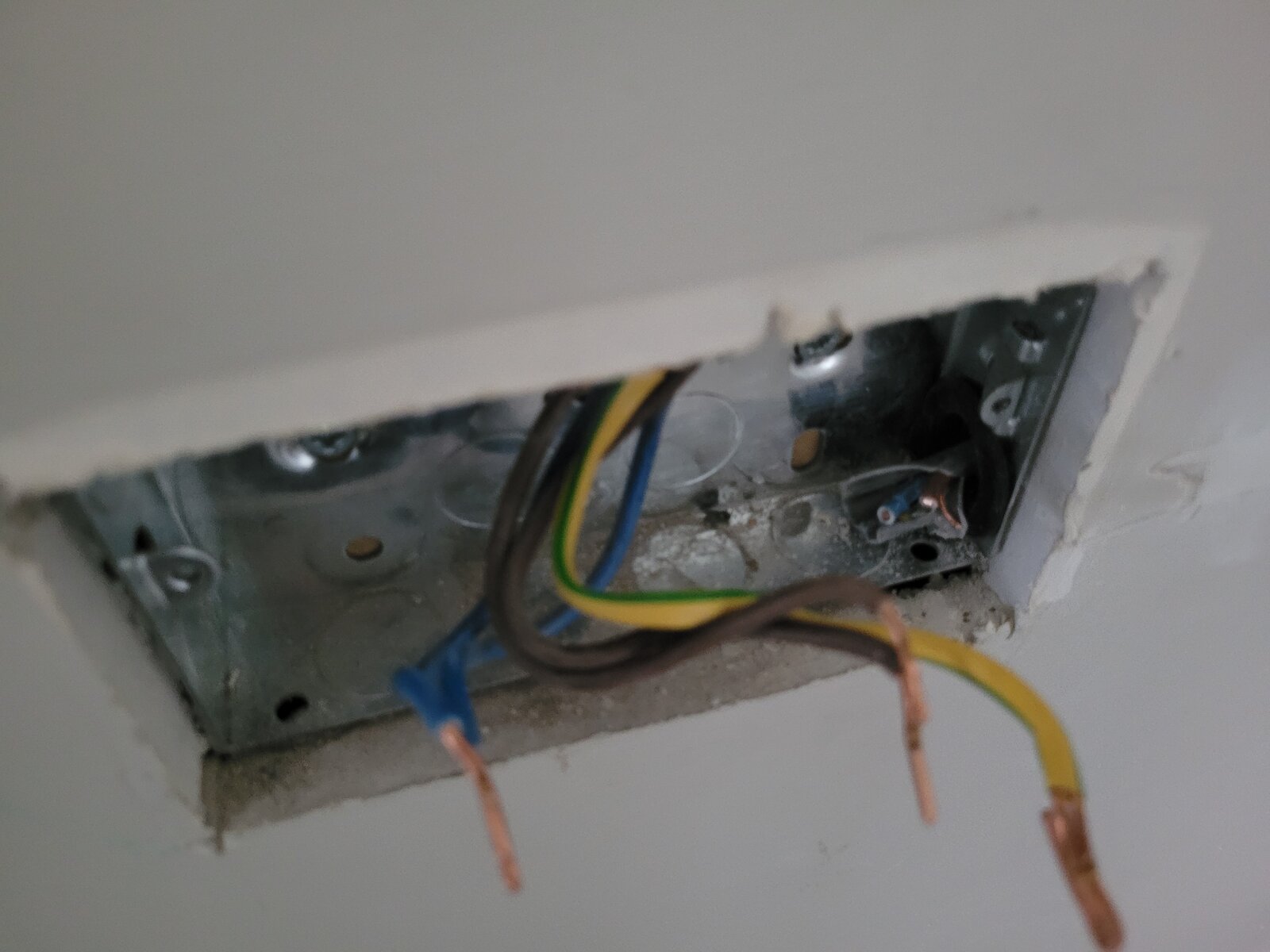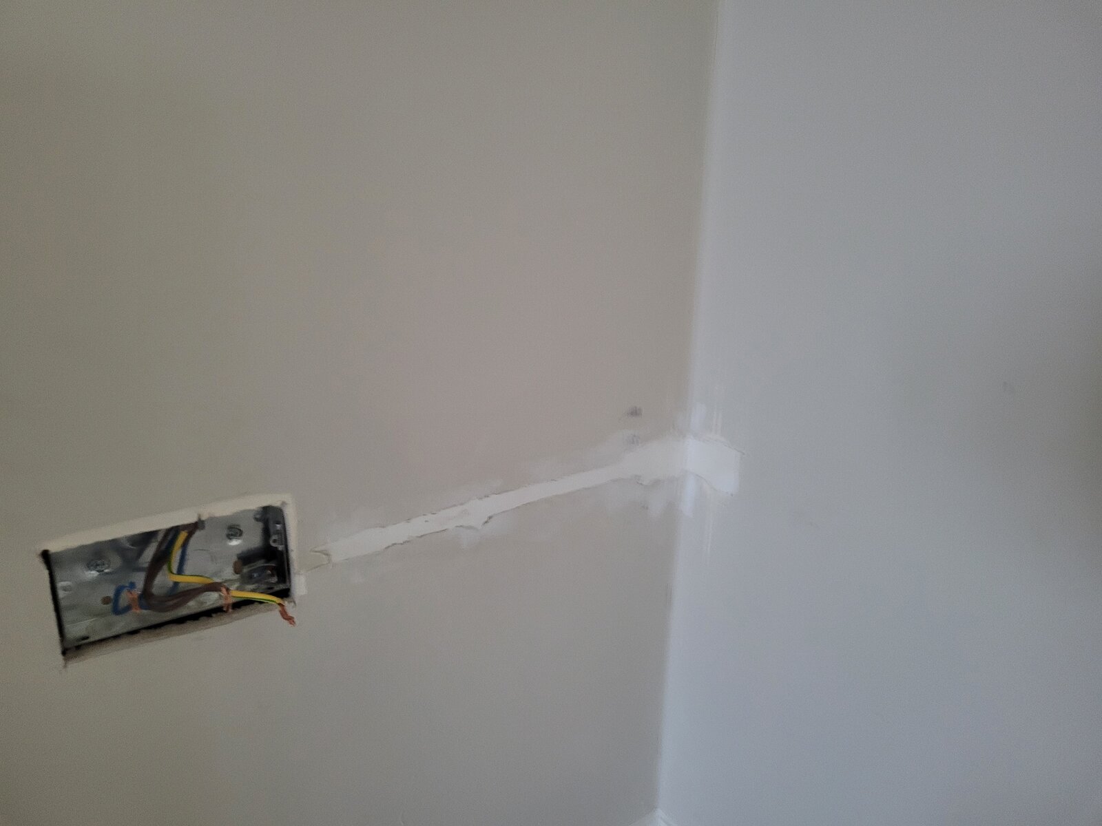 Attached is a pic of the main socket, showing the wiring from the spur socket being chopped off, and a pic of the wall where you can see the path of the conduit by following the filler...