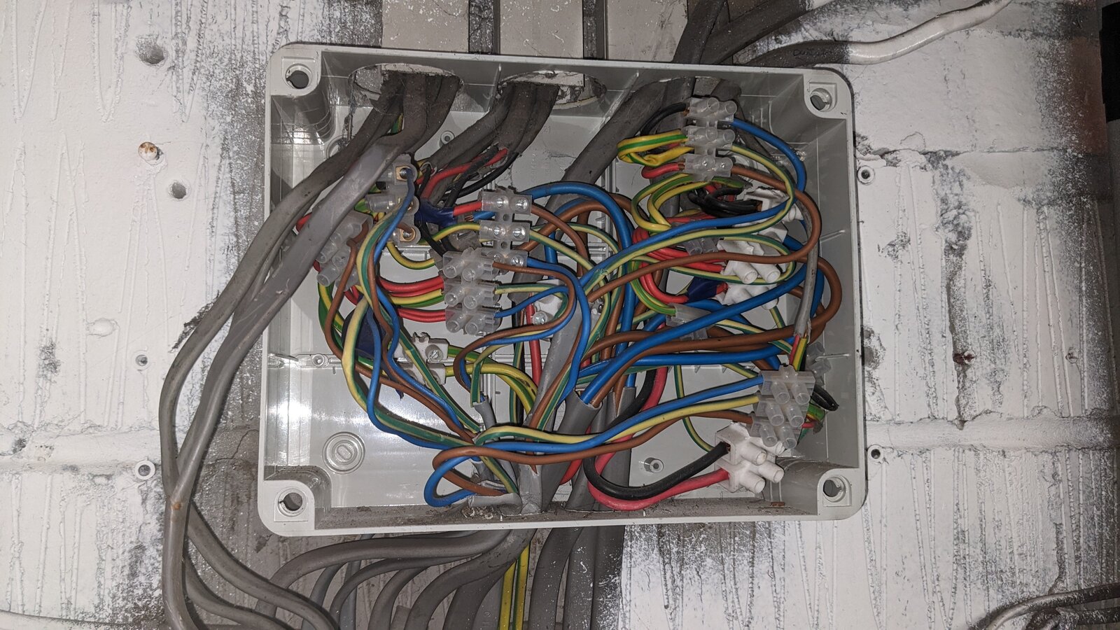 I've fixed the immediate problem, but on a more serious note, is it worth re-doing this properly, and what would you suggest using? This is basically a sloppy install of a consumer unit, presumably by an electrician instructed by a previous owner of the house. It's extending the wires to a newer consumer unit, which is below this junction box.