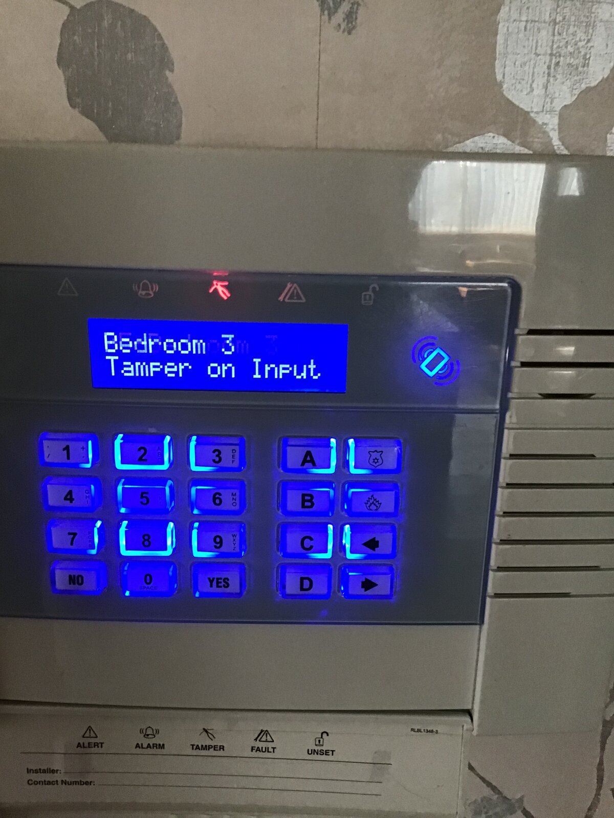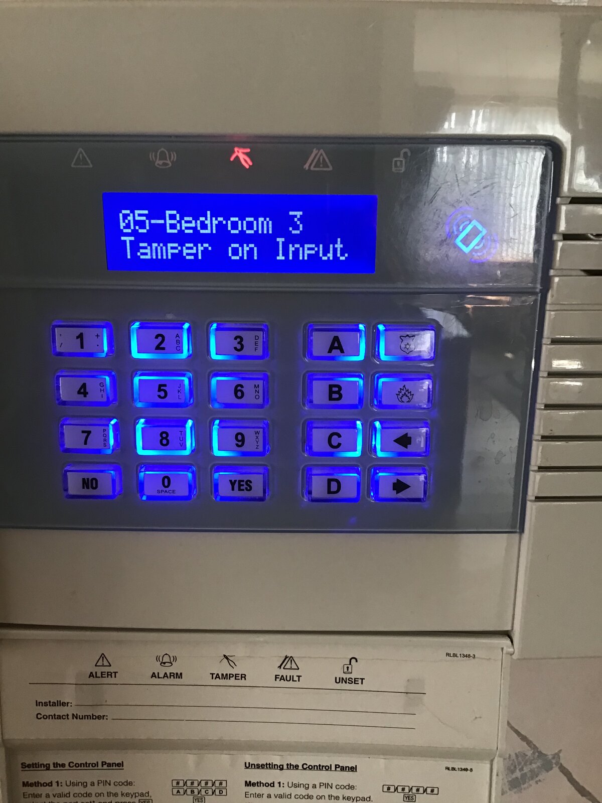 I am unable to set the alarm for my house. The reason is I get a message saying there is a tamper alarm on one of my bedrooms. I went into engineer mode and checked the pir and everything looks normal to me. I still get this message. Because the bedroom is obviously a part of the house the alarm will not set.