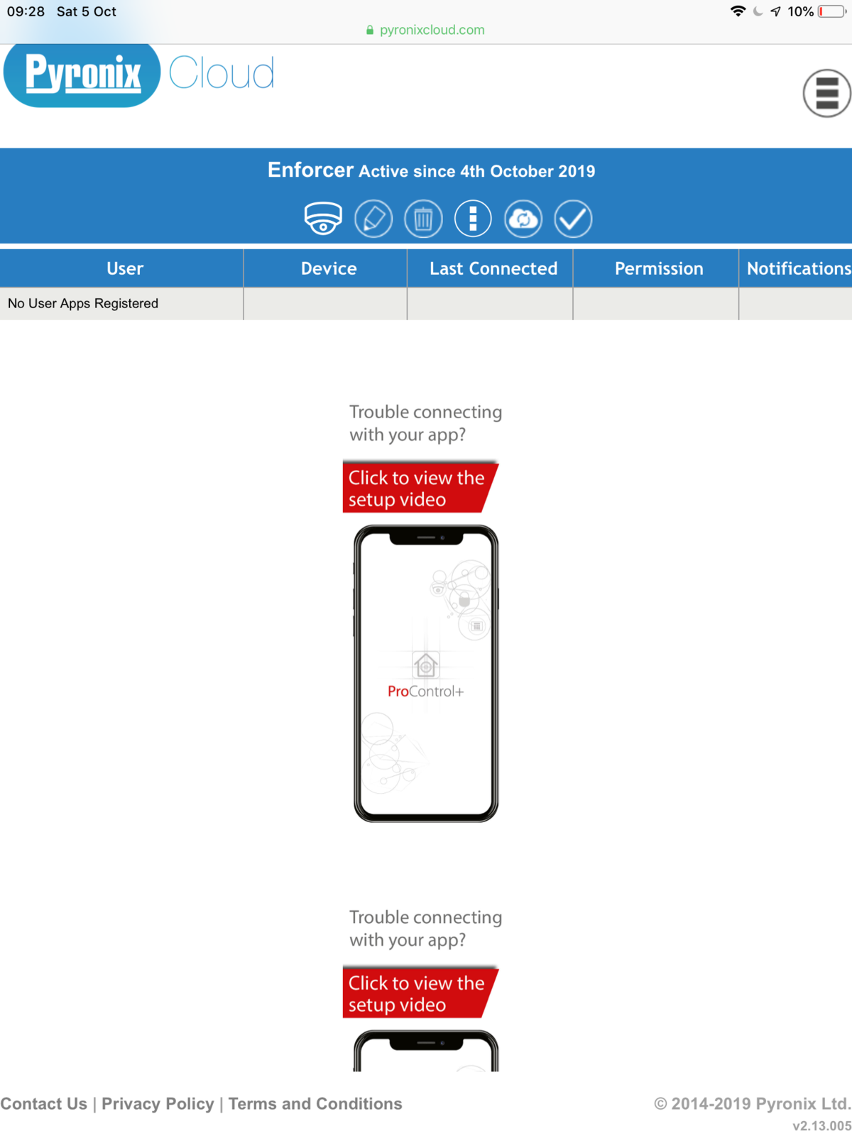Thx for reply’s guys. I’ve created cloud account and enforcer is on there from 4/10/19 (see pic) but under User shows no user app registered. Enforcer shows on app but when I double click it I get the error message about phone not registered..... can’t see a way to register phone on the cloud site. During setup I entered codes sent to my phone by pyronix so it should be registered. Is there anything else that could be set wrong?