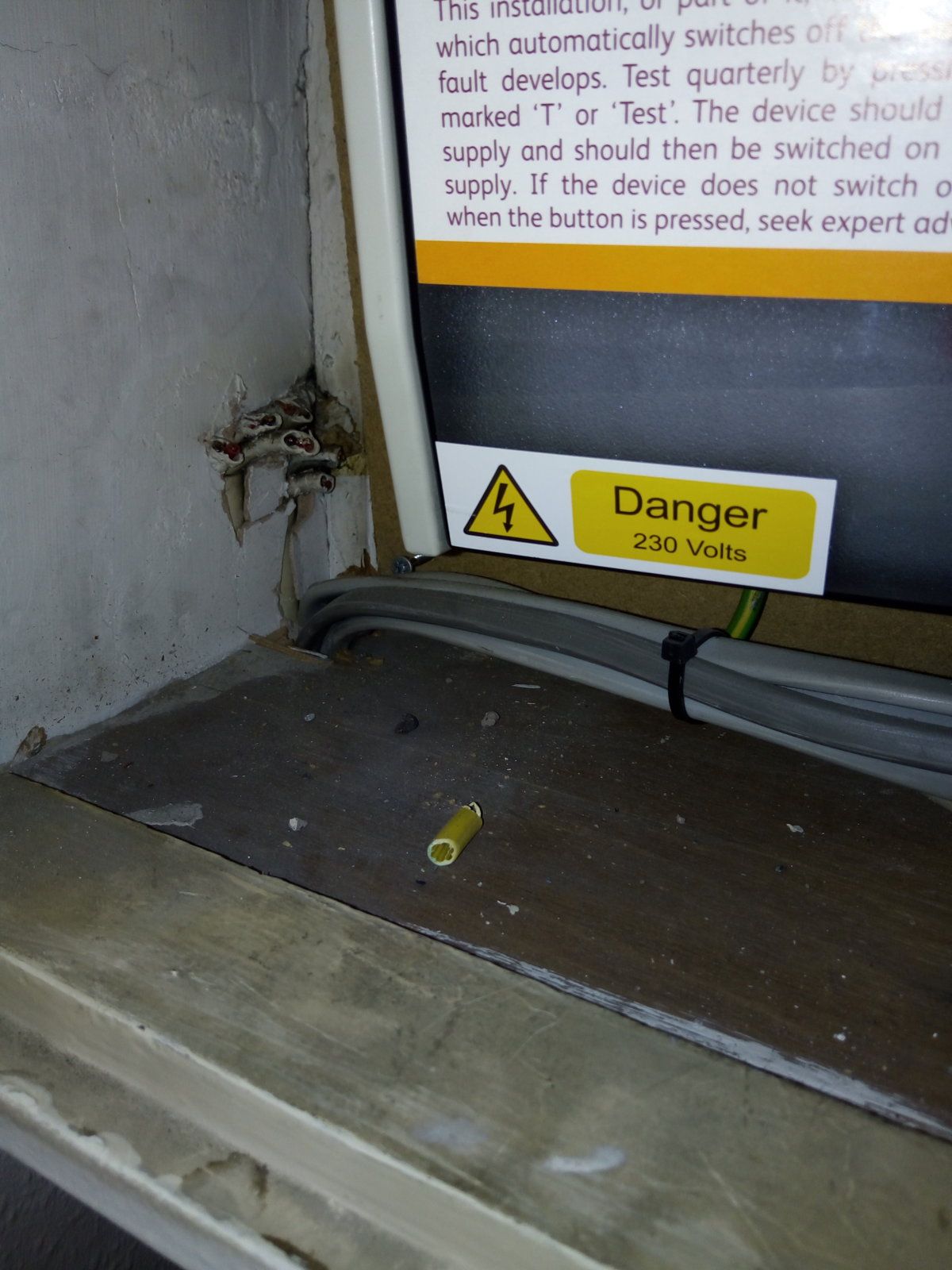 hi hi guys I'm looking to get some help advice I know very little about the electrics, so hopefully this is the right place to come I have just moved into a property and I'm noticing a few things that are concerning as I'm decorating and I just want to get some advice essentially my electrical cupboard which sits above the main entrance door the fuse box is not attached it's kind of hanging off the wall, there is rubble inside the cupboard, lots of different wires and I don't really understand what they are but there seems to be more wires coming into the fuse box than going out to the fuse box to my apartment there is a singular white wire which hangs on its own and also there is a big hole in the wall next to where the electrical wires coming to the property with a pipe inside of it and I'm unsure as to what that is and why that's there but it appears that the Rubble that's in the actual cupboard could be from that hole