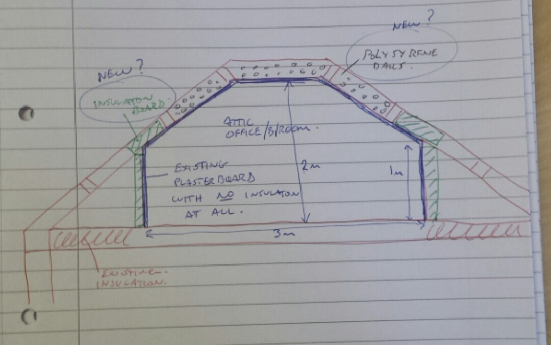 As the title suggests I am wondering how to semi insulate an attic room that has zero insulation so that I can take the edge off the cold. I don;t sleep in there bu have my office in there and it is very cold even with the rad on full. I have little money and do not want to pull off the plasterboard. What I can do is access the vertical eaves plasterboards from inside the eaves so I wondered about using cheap polystyrene panels and hot gluing them onto the walls so that at least the sides have some insulation. I thought about injecting polystyrene balls into the ceiling voids but am concerned about condensation long terms.