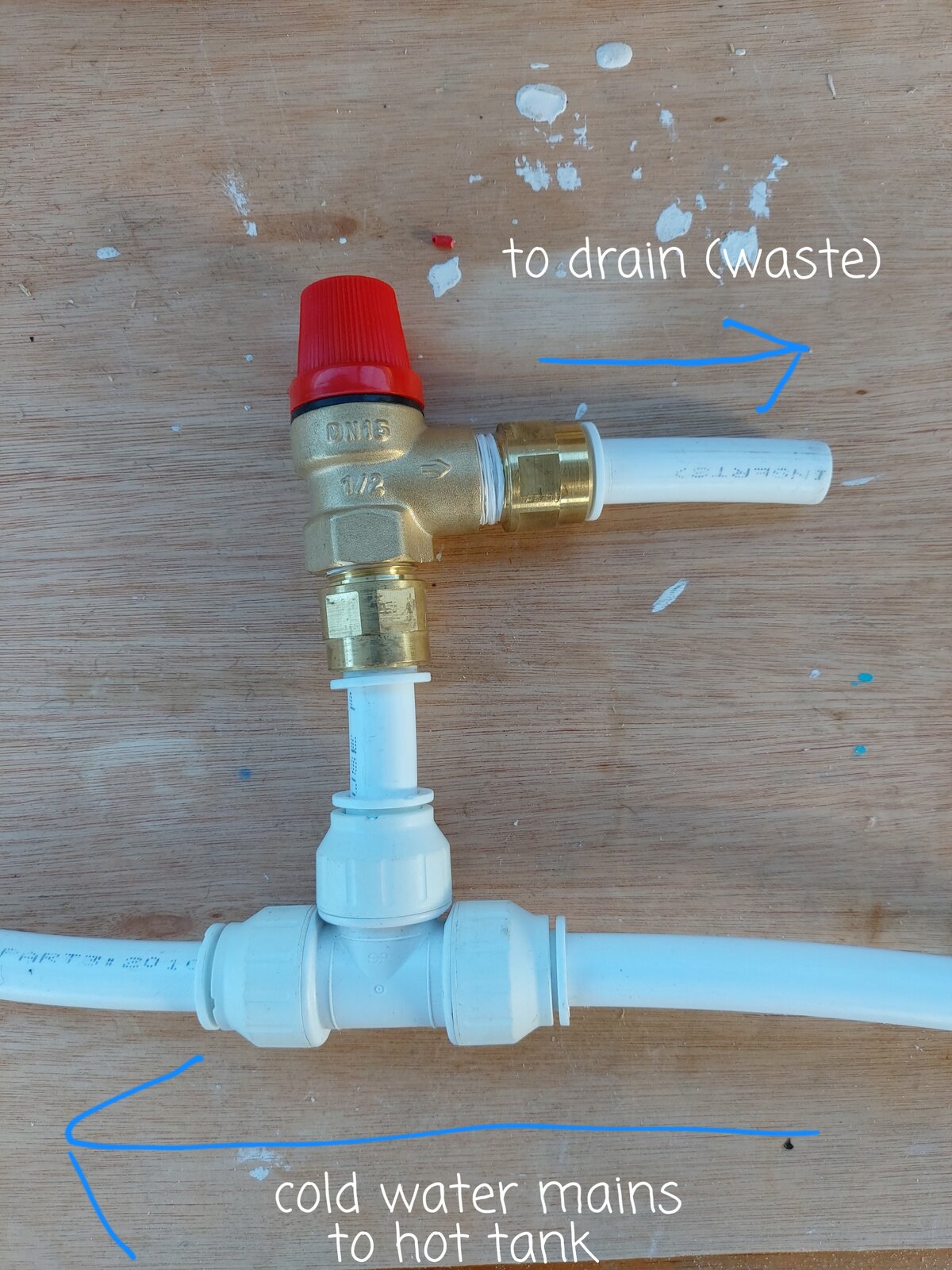 Is this the correct way to fit the pressure relief valve? The top pipe will then just drain overboard.