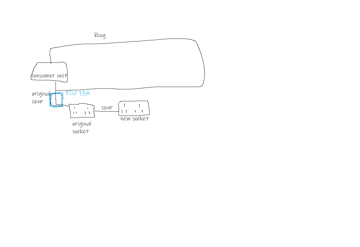 My plan is to feed the wire from one of the single twin and earth in the kitchen in to the wall and add a fused connection unit on to the wall, then spur from that to 2 new sockets.