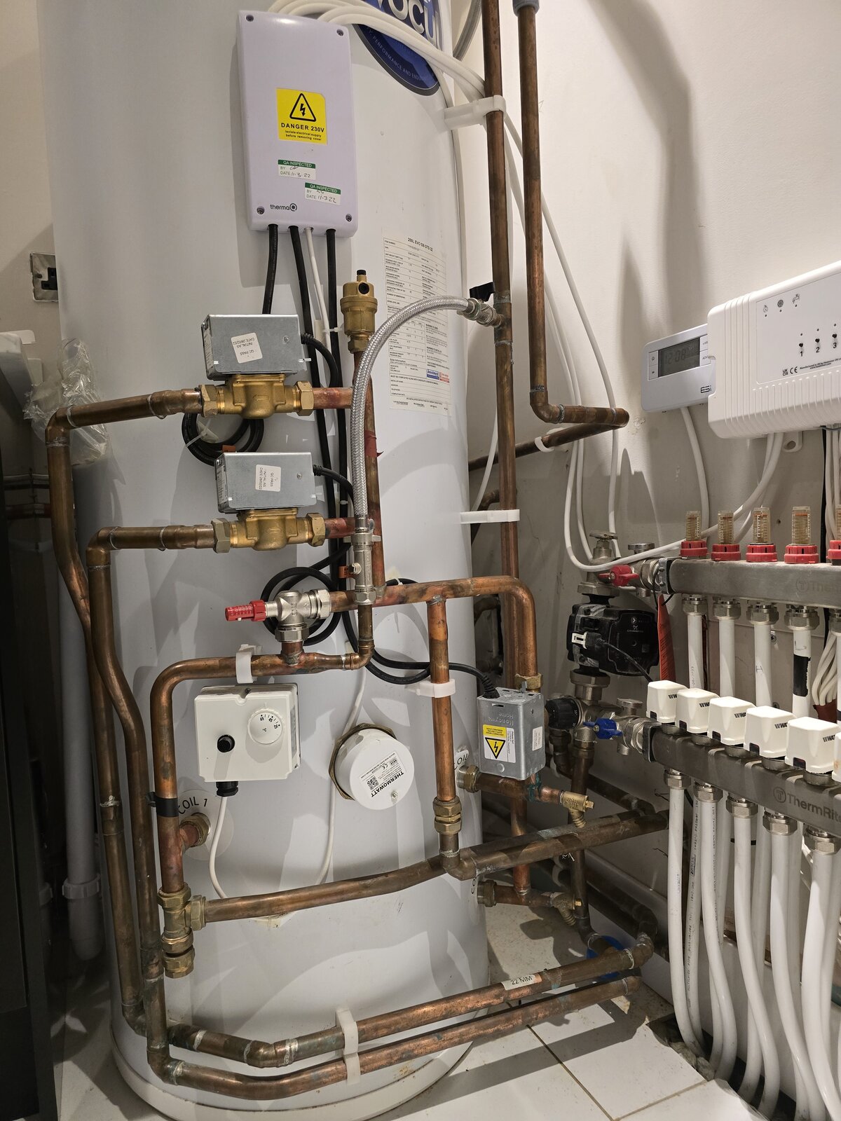 I also have a pipe which is a run from an outlet labeled coil 2. I presume this is the boiler return outlet . This was also hot to touch .