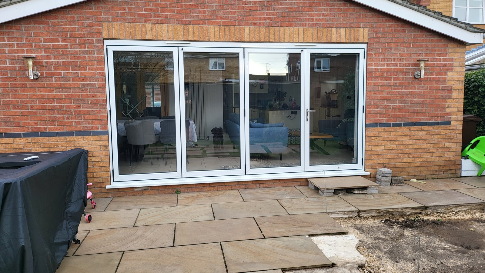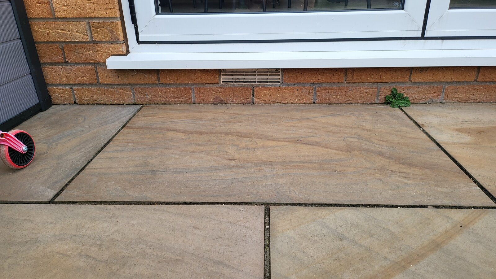 There are two underfloor vents (assuming that's what they are). Any ideas what I could do about them? If I put the patio slab under the sill but not all the way back to the brick would that work?