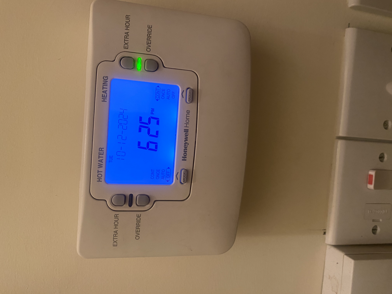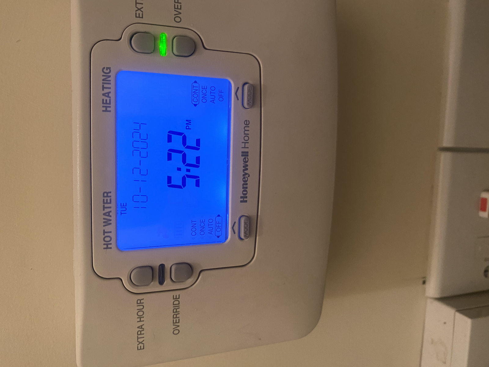 Your Honeywell programmer has a mode button ,bottom right corner,press it until the indicator ( currently in " off" mode for heating) moves up to continuous. Show us a picture once done, See if radiators start to heat.