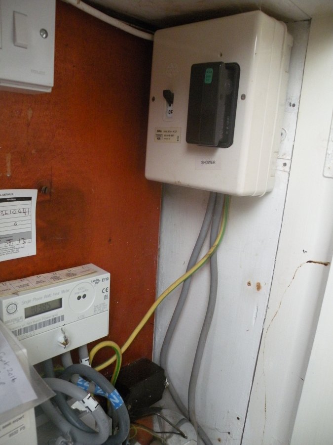 Pictures show present set up to supply shower. Wylex 80amp CU with 45amp cartridge - (this unit is separate to main CU ,which has a Main Switch RCD - no spare spaces)