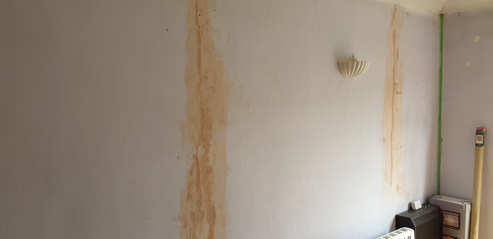 Trouble is, on taking off the old wallpaper, it looks like it's currently simply plaster on the turbo block of the internal leaf of the cavity wall. It's obviously had some shrinkage over the years and has been patched (badly). See the pics.