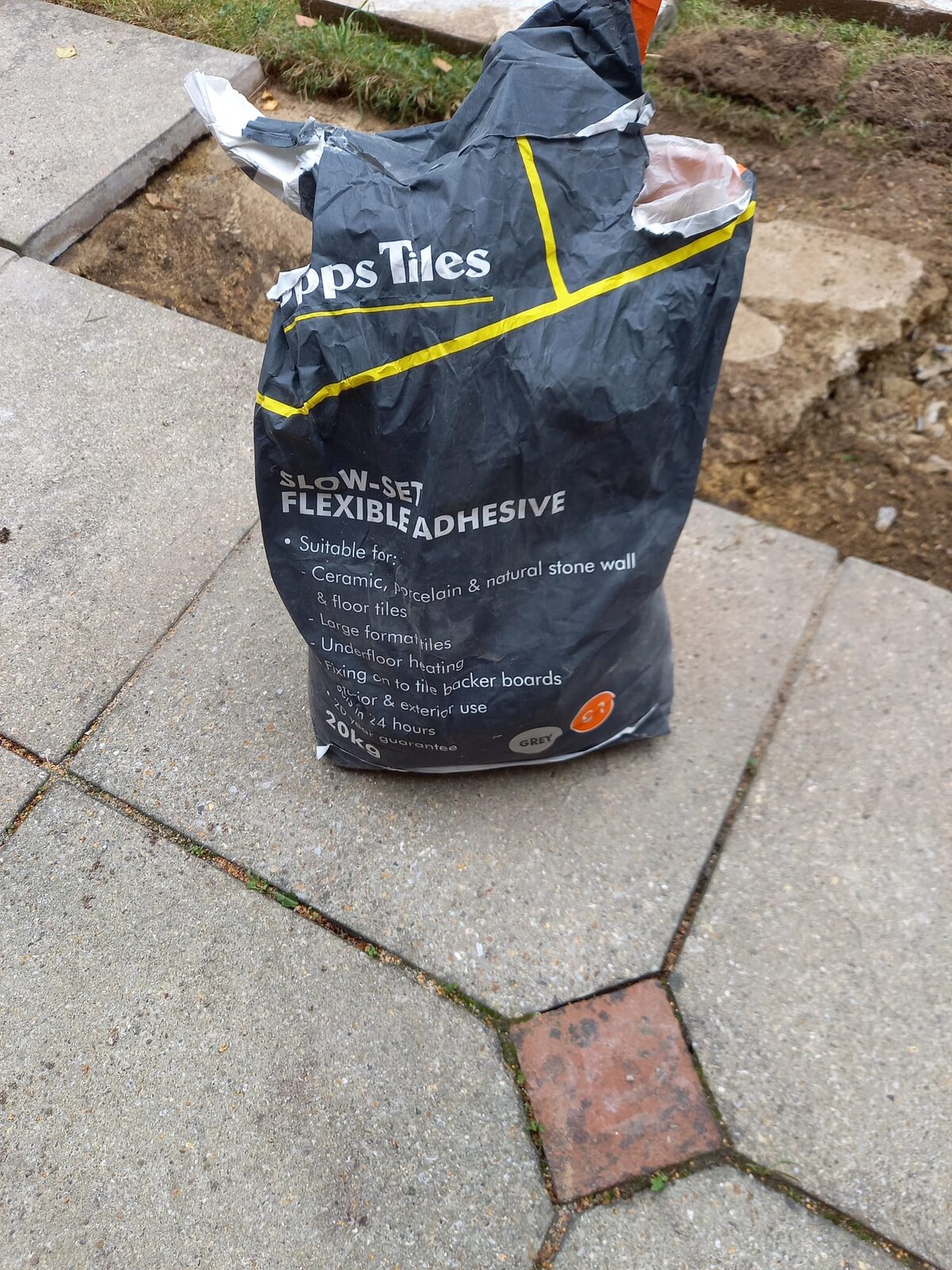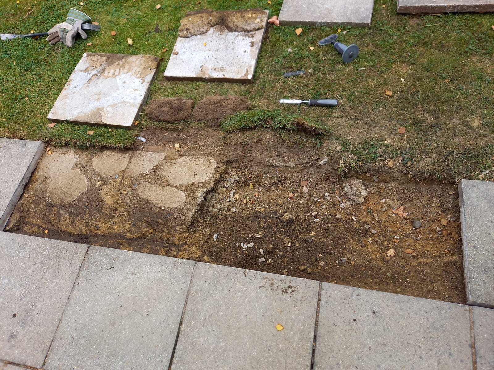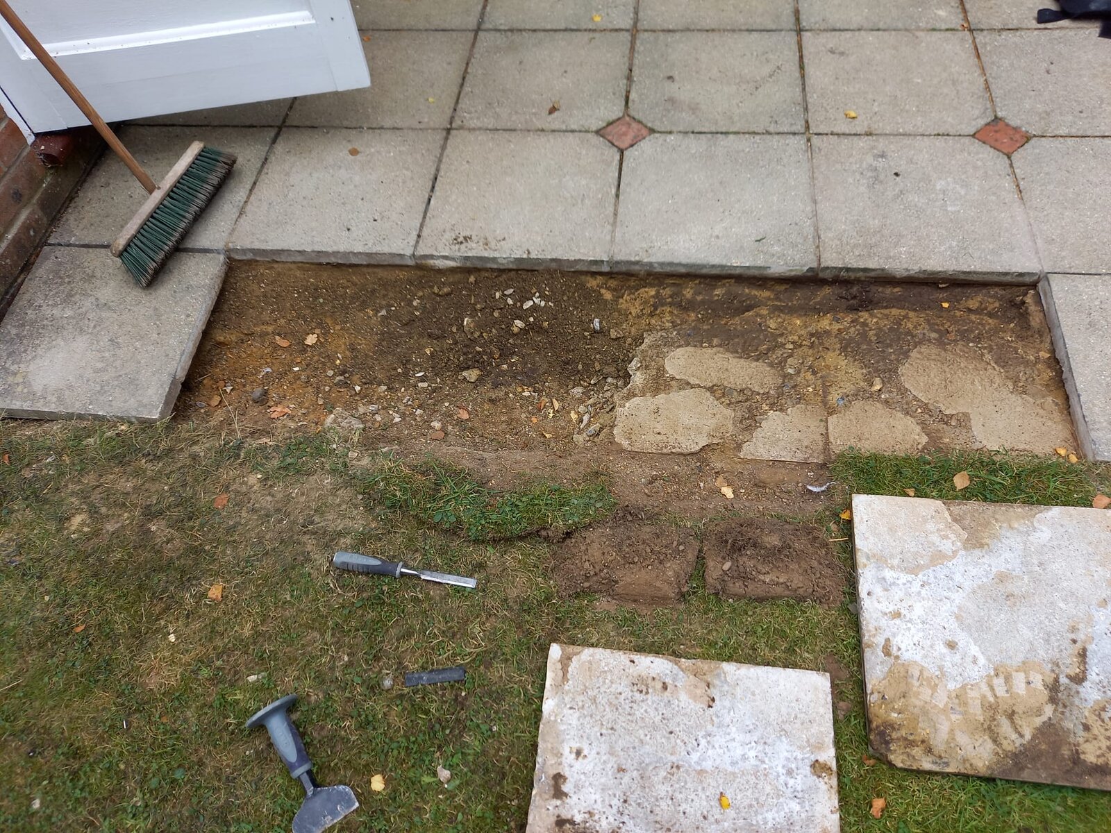 I've taken up 6 paving slabs as there was a gap opening up. 3 I have taken up with the concrete underneath (and taken off what I can) and 3 which I have managed to peel off the concrete as there was no way I was going to pull out from underneath. I want to re-use the paving slabs so it still matches.