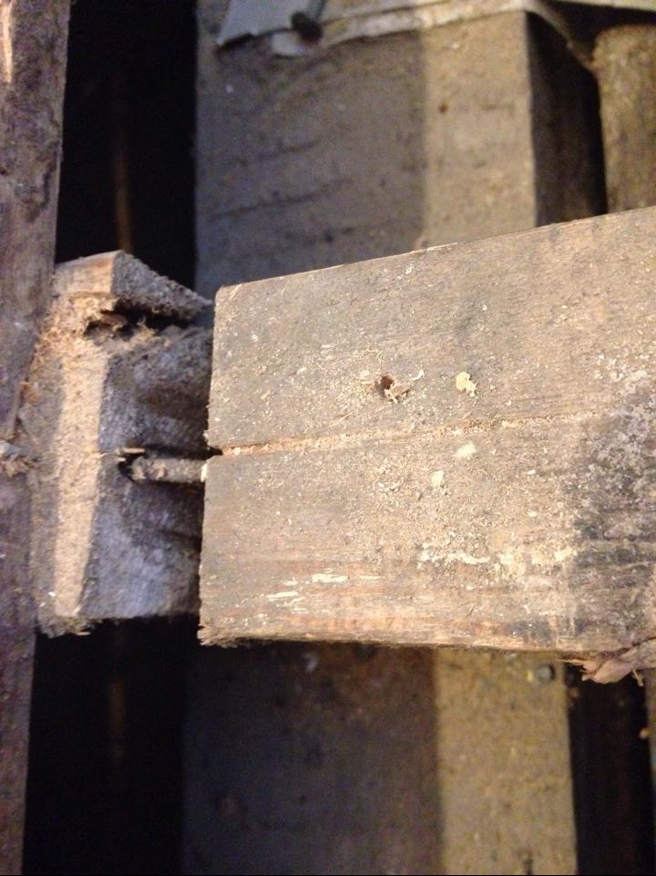 The floor joists in one room are generally in good condition but as you can see from the picture they are made of two pieces of timber, joined in the middle. Because the wall plate is slightly bend some of the joists are a bit higher and some a bit lower where they join which makes for a slightly uneven floor at that particular spot.