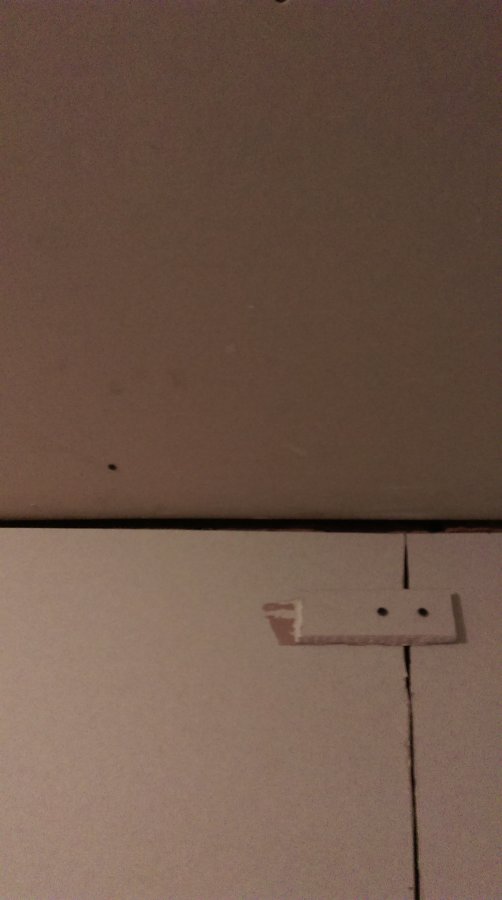 Well I really made a bit of a #$%& of this bit of plasterboard in another room I did. I forgot to screw in one of the plasterboard edges to the ceiling rafters, upon realising this I decided to put the screws in and get rid of the bowing board then all of a sudden I get this nice 20mm gap appear where the wall meets the ceiling. The wall board isn't long enough now so how can I get around this? Whack in some dot and dab before it gets skimmed?