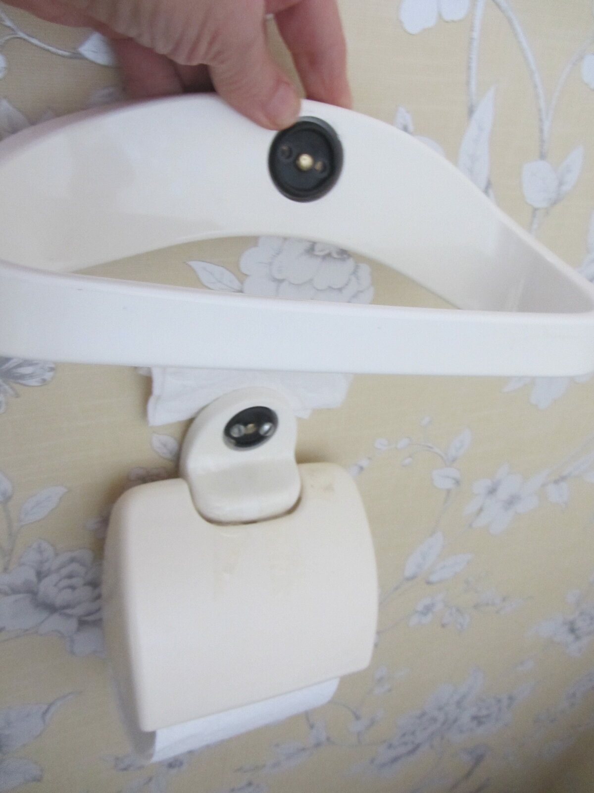 It's strangely complex and I can't work out how to refit it, though screws are in the wall ready for reassembly. The loop thing obviously screws on behind the paper-support-and-flap, and hold it a sufficient distance from the wall. However, I can't slide the support/flap through the loop to screw in, because then then the flap doesn't raise high enough to insert full roll. But I can't screw it with flap hanging over front of loop as it's at a crazy high angle and doesn't rest against the paper. I can see no other way of assembling it.