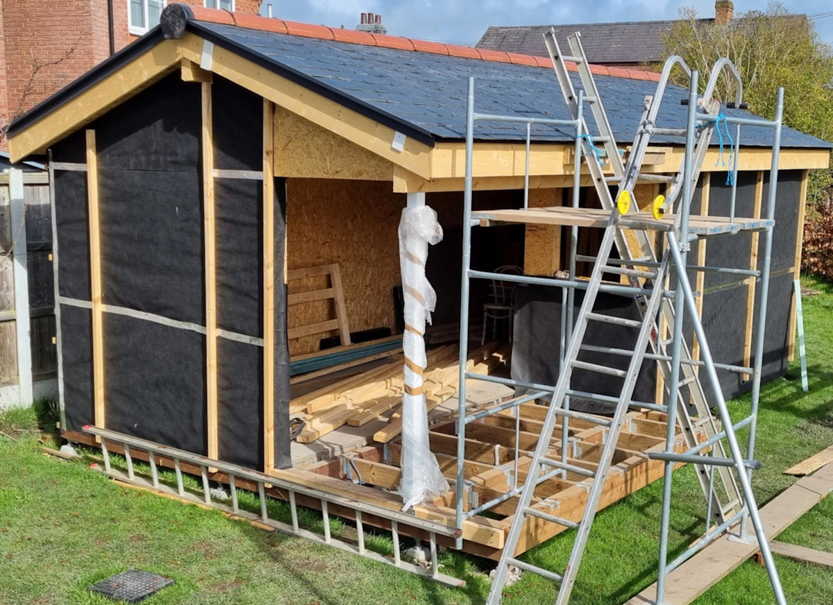 I'm finally (almost) ready for adding a roof to my green oak 5x4 m shed/workshop build. Its a gable roof over raised tie trusses but has a lowish pitch of 19 degrees.