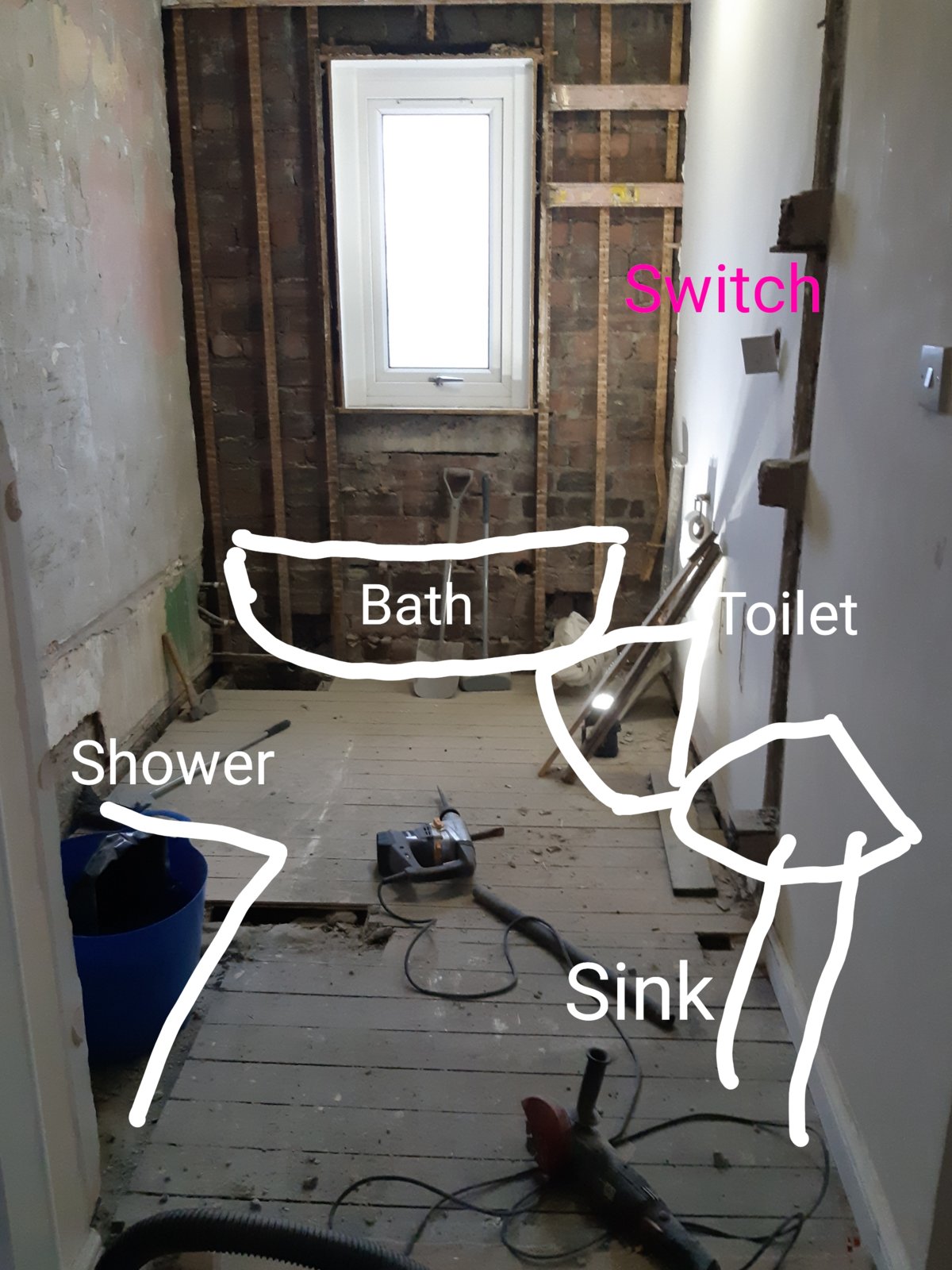 Tried to draw bathroom plan, once wall has moved and new bathroom is fitted the switch would be between the sink and toilet which would be an extremely odd place to leave the switch.