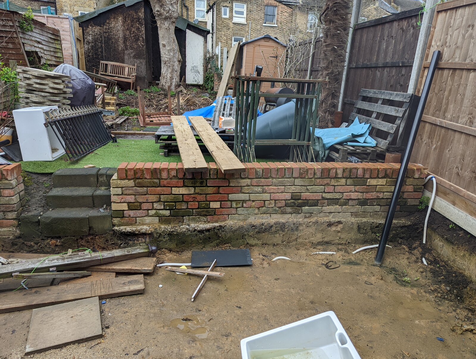 My husband, my father in law and I built a retaining wall in the garden a year ago. We then had a kitchen extension that due to poor planning on behalf of the architect or builder was too low and so the patio had to be dug down just over 1 foot, going below our foundations.