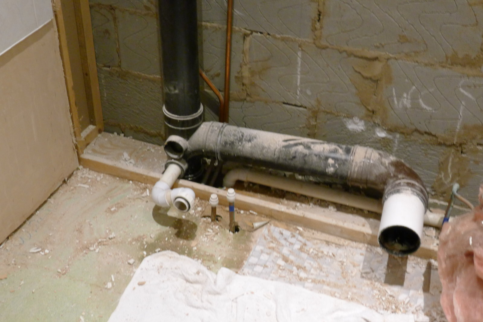 The existing 100mm poo pipe needs relocating, but everything is welded in. The bath waste position is ok, but I need the poo pipe to come out the left side instead so I can fit a 90 degree bend and run it along the left hand wall.