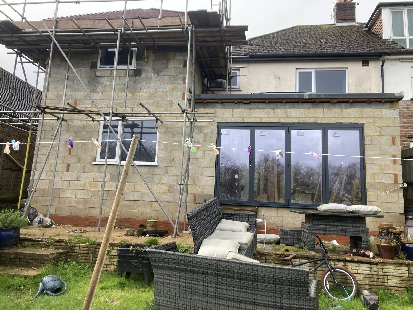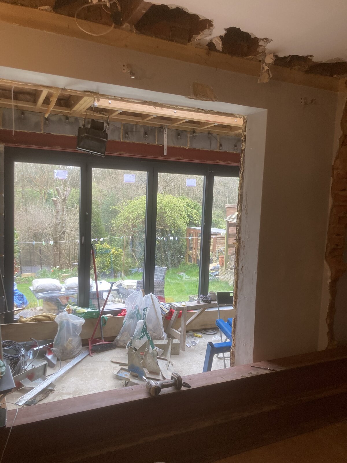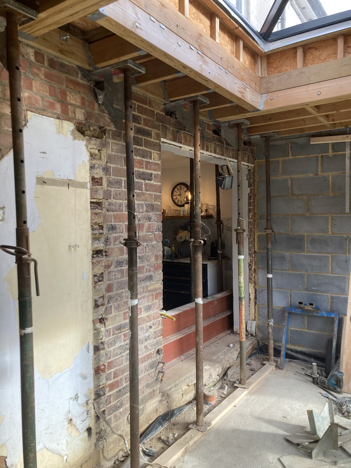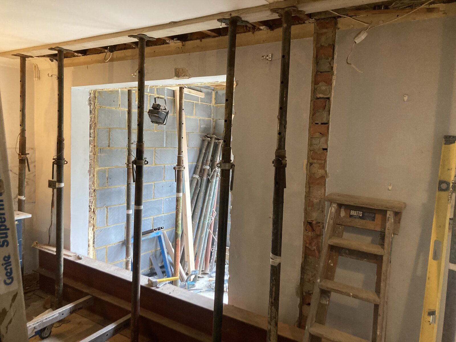 We are building an extension and removing the back wall (bedroom & bathroom above). We have structural engineer drawings and have the beams as specified. The opening is 5.1m long. The wall is a cavity wall & the joists sits on the cavity wall. We are holding up the floor above with scaffold boards & acrows, alll sitting on solid floor. Will strongboys suffice on the outher wall ? We have placed them approx. 800mm apart, 6 in total for the 5.1m span. They are all in place, but we have not yet taken out the wall. Any advice/ reassurance about the strongboys / acrows would be appreciated, My concerns are if the strongboys will suffice due to the span of the opening - thank you