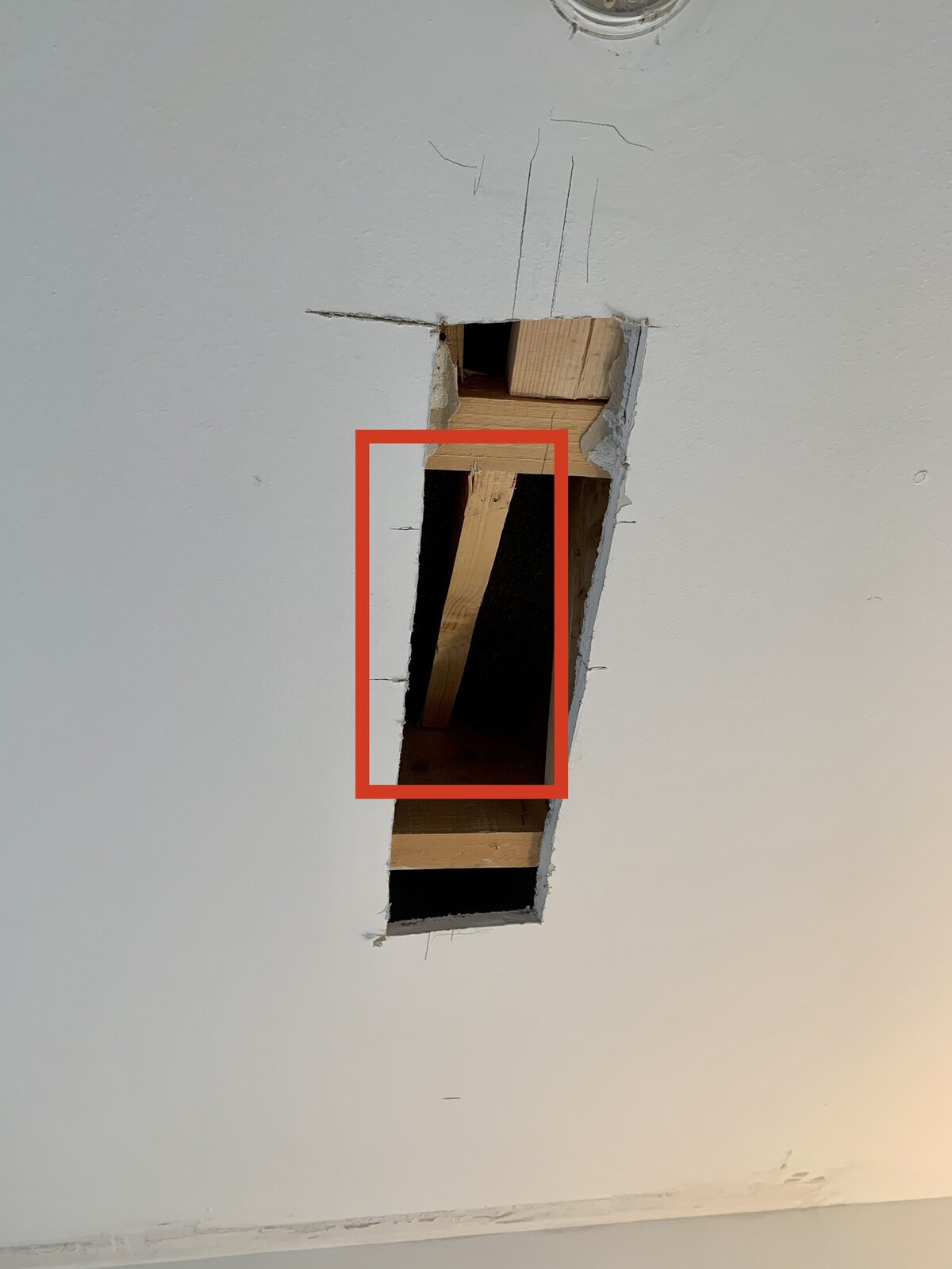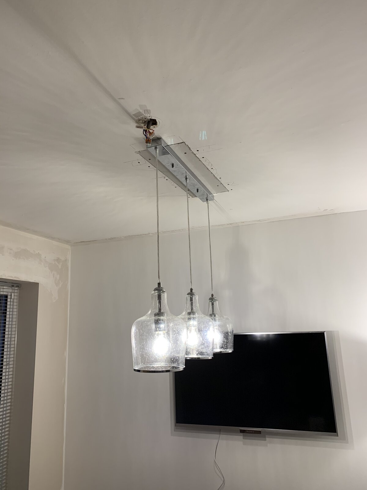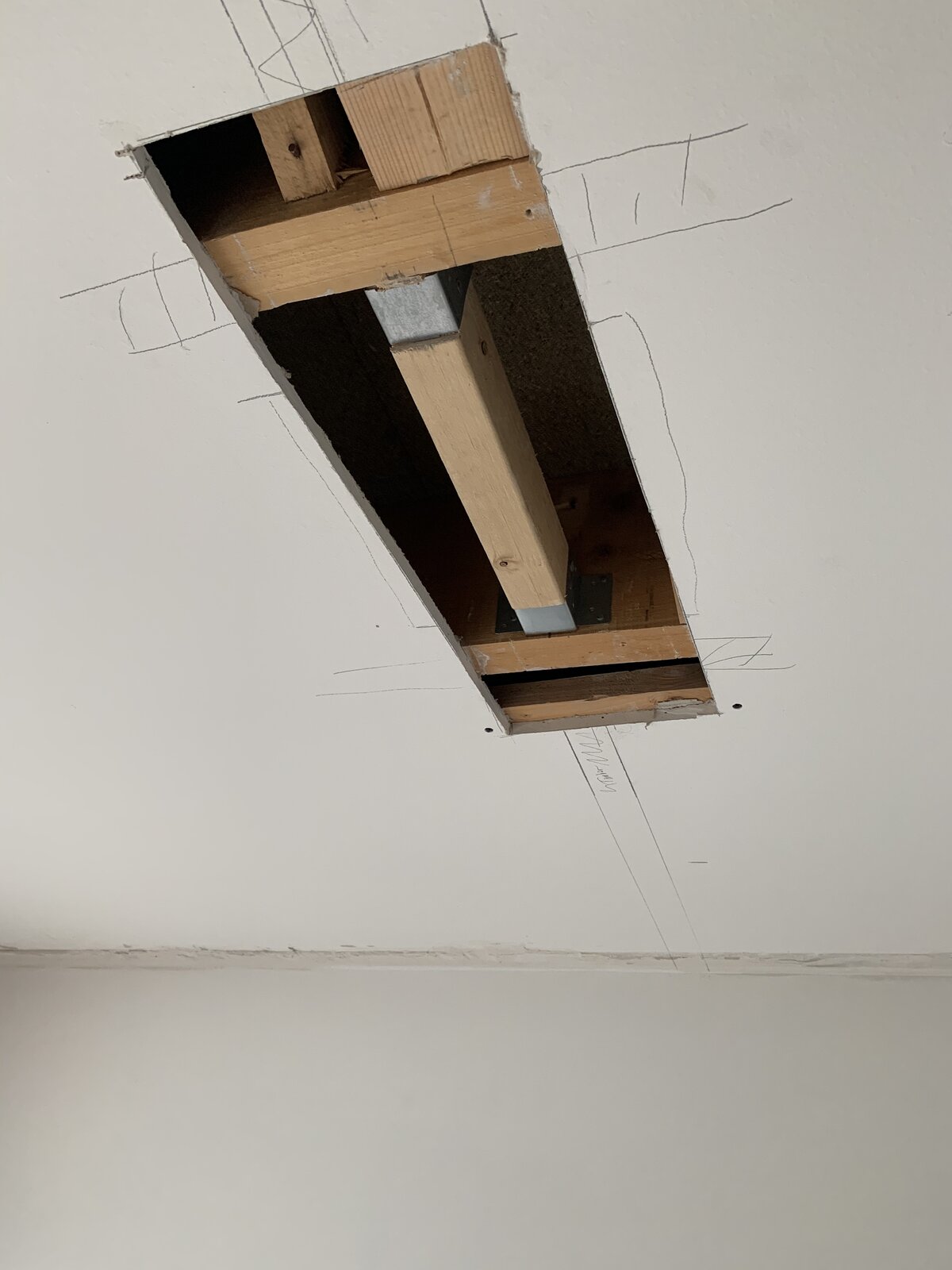 For me that would be the ideal solution too but that would mean the light fitting would not hang right over the centre line of the table and there is very little room to move the furniture around. It all lines up with all mounted tv too. It’s typical that’s where I need it to be!! I’ve just had this chat with my wife but she really wants to keep the table where it is.Any chance of re-thinking your plans and moving your proposed Noggin [say] 50.mm / 60.mm left as seen in your image?