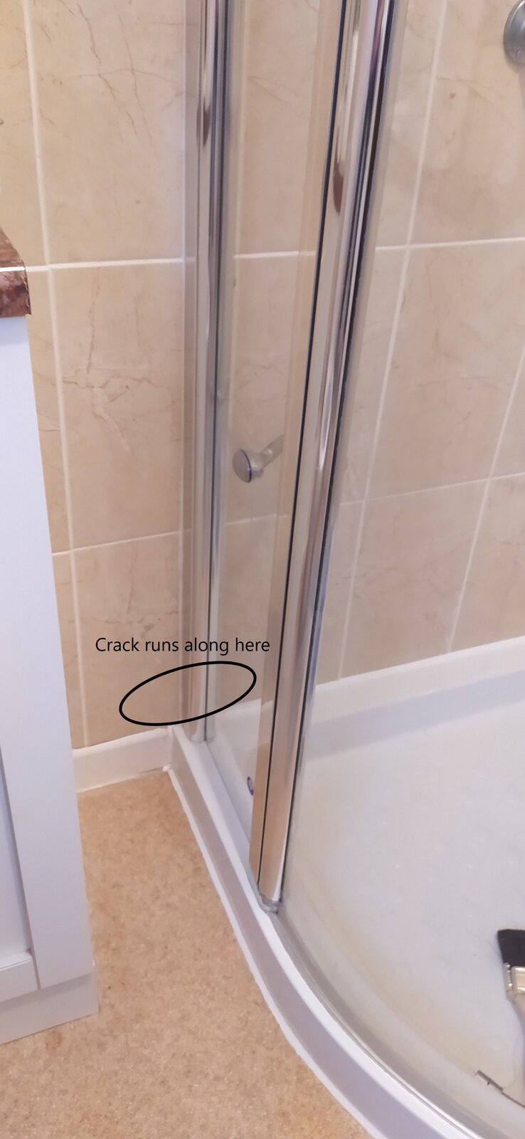 Having read about this on this forum, I'm now aware of weep holes in showers - I noticed that it was all sealed up on the inside, which I understand can lead to water ingress so I started to remove some at the bottom (where you can see the gap in the closesup) to see if any water ran out after passing some where the glass pane meets the frame, however nothing ran out so I suspect it should be resealed. Incidentally, I did also remove some sealant running up the inside of the frame beside the crack to check if I could see any obvious gaps where water could seep through, but it seemed ok.
