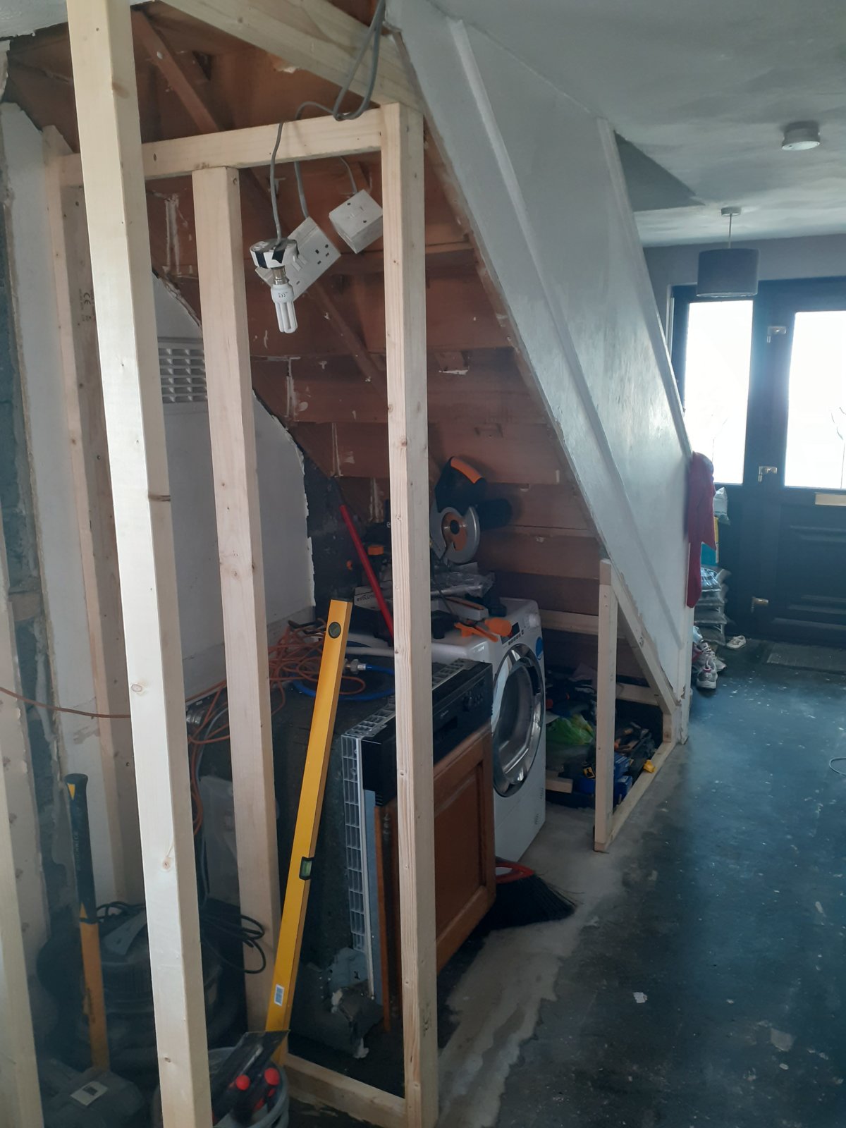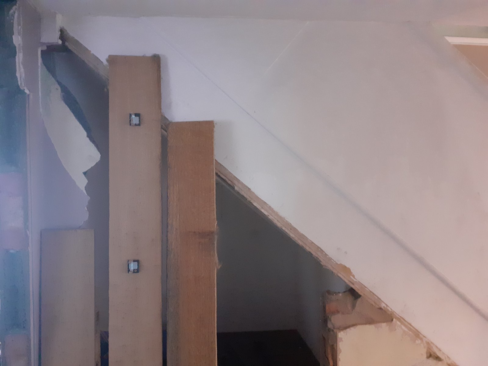 I've removed a small doorway that had 50mm blocks on top.It appears that plasterboard is imstalled on the underside of the stairs and there a a few gaps between the wall and the plasterboard. So I'm sure if the wall is supporting the stairs. I'm planning on building a temporary frame where I made the opening before removing the bottom section of wall. I will then build a frame at the bottom before removing the mid section of wall and framing this. Does this seem like a sensible approach and what size timber should I go for?