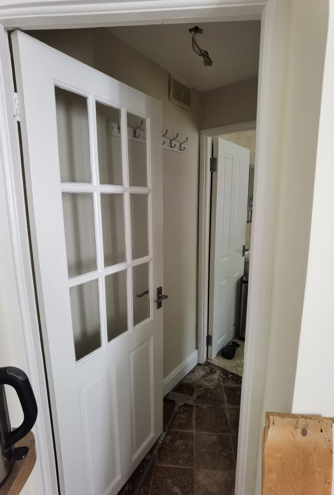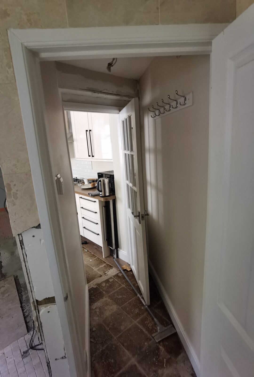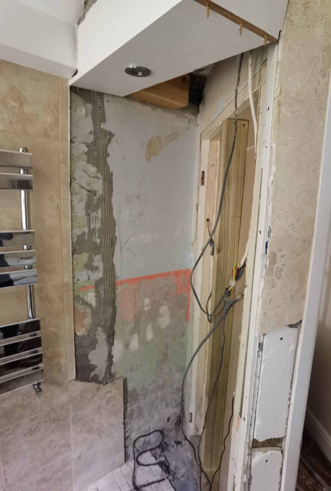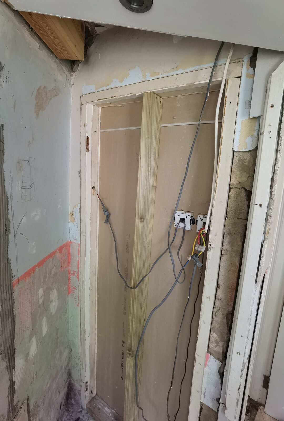 In the past it was used as two separate doorways coming off a small hallway, that lead onto a separate WC/boiler room and the main bathroom. One of the walls has since been turned into a stud wall made from the original door that has not been removed. The other door is still there and continues into the bathroom. Blockwork runs along the top of the doorframe and brickwork along the edge coming down. It is currently housed by switches etc as was covered by a cupboard in the past.