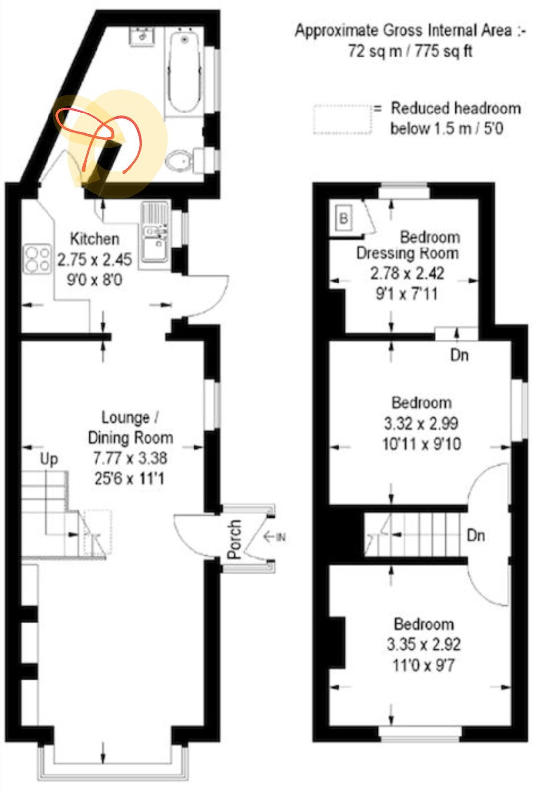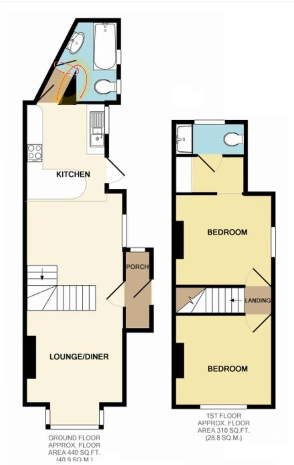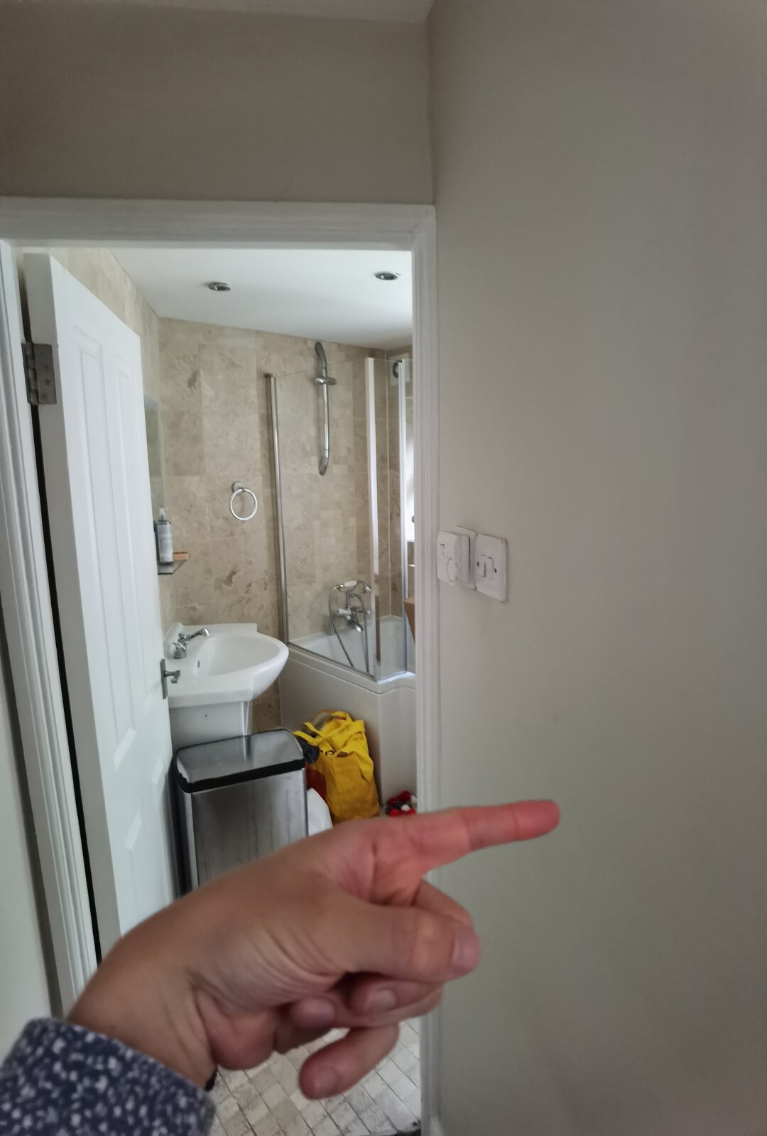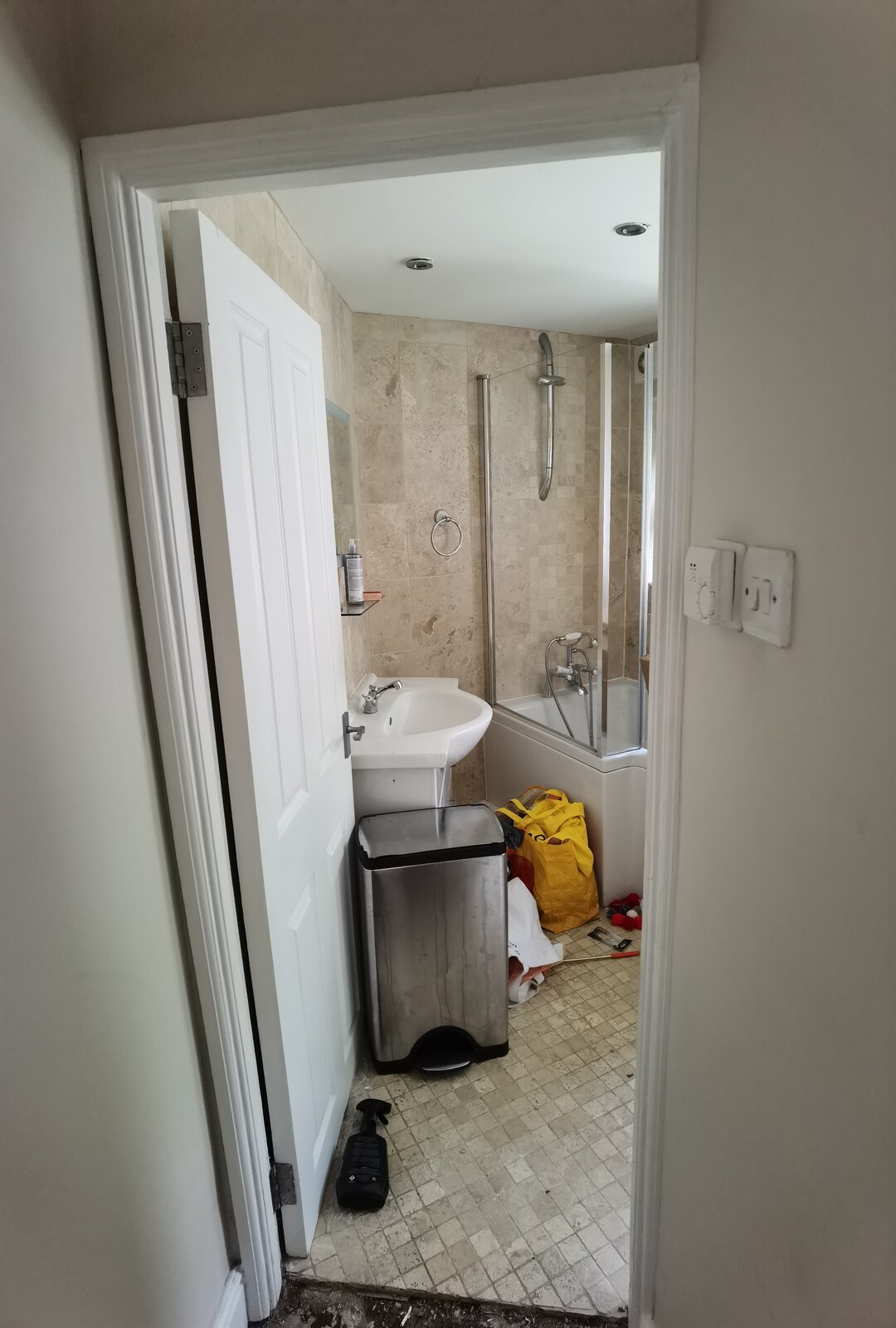 In the past it was used as two separate doorways coming off a small hallway, that lead onto a separate WC/boiler room and the main bathroom. One of the walls has since been turned into a stud wall made from the original door that has not been removed. The other door is still there and continues into the bathroom. Blockwork runs along the top of the doorframe and brickwork along the edge coming down. It is currently housed by switches etc as was covered by a cupboard in the past.