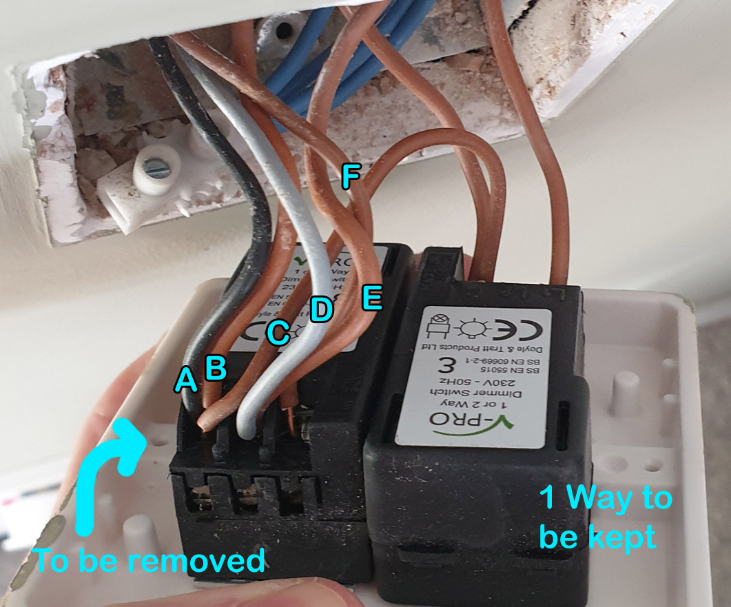 I've searched the forums and I can see the question asked a few times so my apologises if it has already been covered. I found a post from someone who has similar lighting wiring as mine (neutrals together) but they removing the 2nd switch (the slave?) while I wish to remove the primary switch and mine has an additional brown wire (C) connect to the switches I'm keeping.