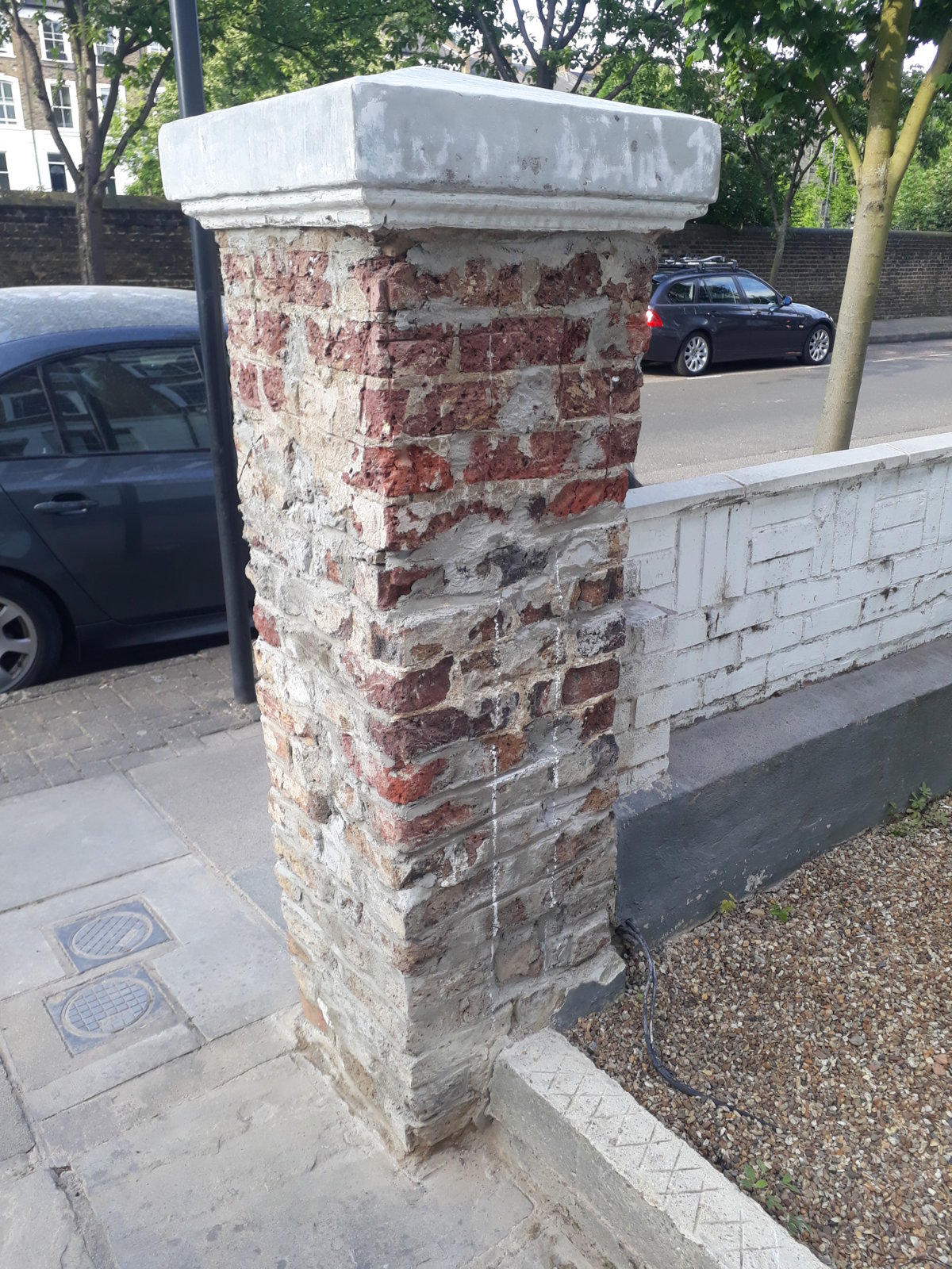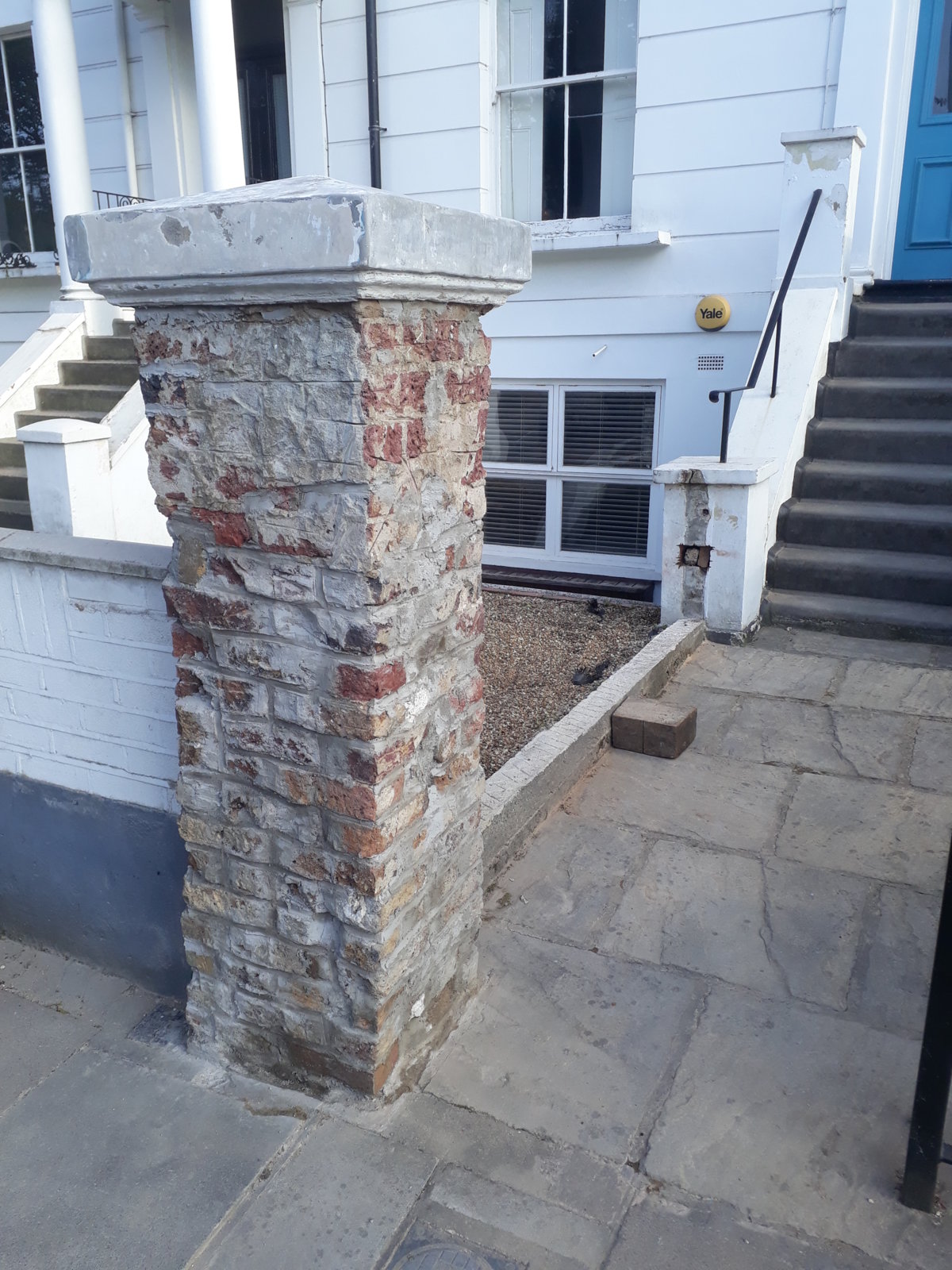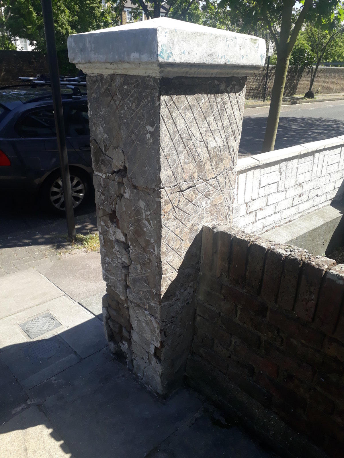 I was hoping for some advise making good on this ornamental pillar. Story is there was flaking paint, a thin layer of plaster and rusty corner bead that came off easily, original render also came off at the bottom where it's damp but aside from there it's solid.