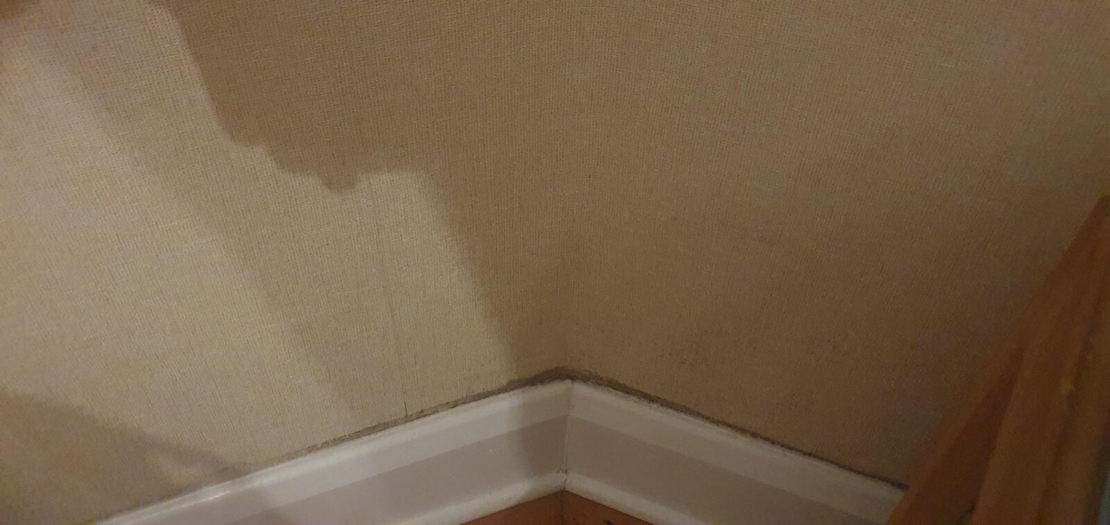 Most of the house external except the front facing aspect is now cavity walled because of extensions. I started to notice the wall paper in the front room lifting and damp/mold appearing above the skirting board since the new render was put on. I initially assumed it was because the old render was taken off and it took a month or so to re-render and as we weren't living in the house whilst we did the work it wasn't being heated as usual. It hasn't gone away and if anything is getting worse. This is only affecting below the bay window area internally. The pillars that form the porch are also damp on the inside but this is all outside so I'm not as bothered.