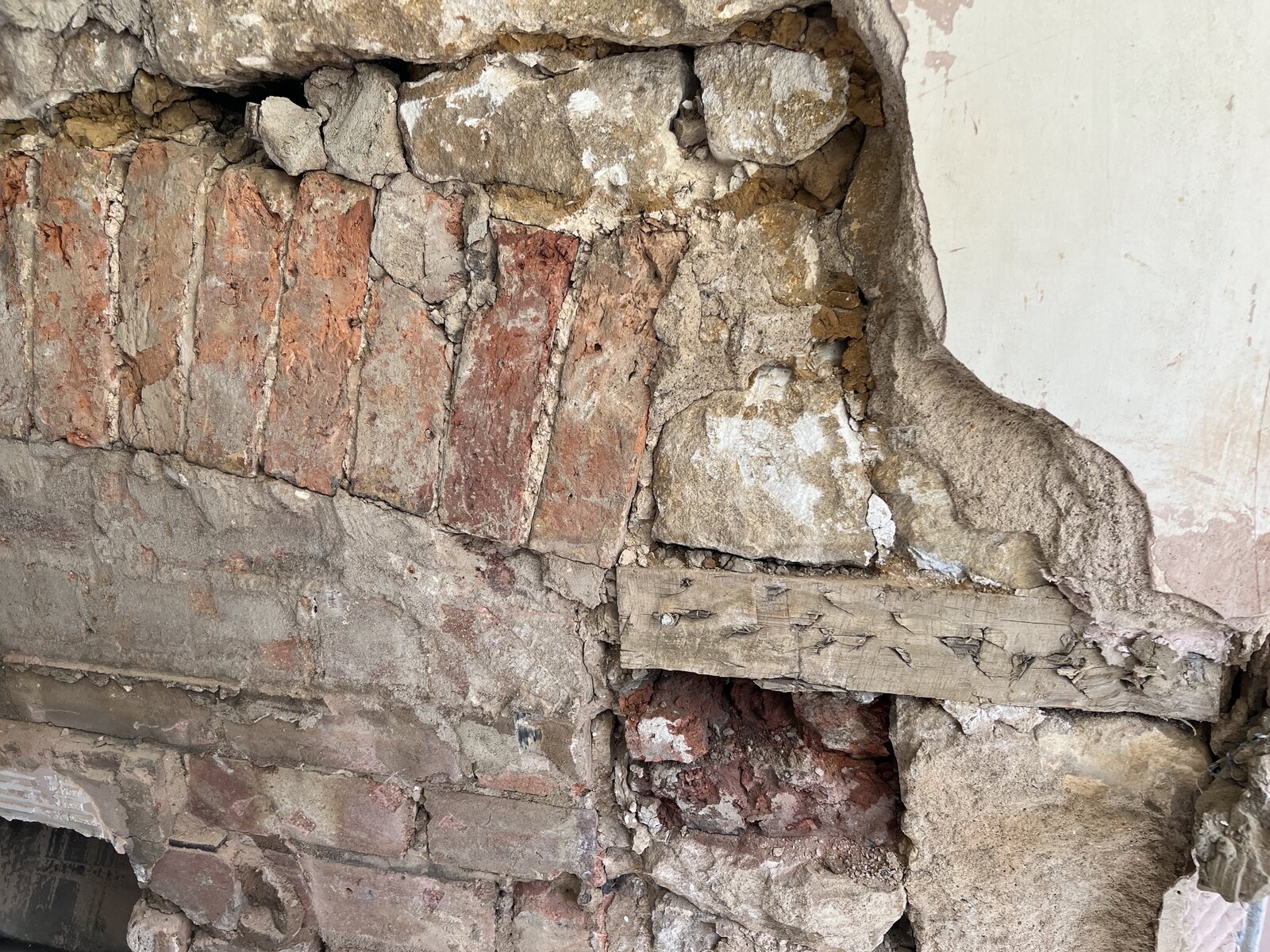 Removed the render covering the wall to find where the stone ends from the top of the breast there is a brick arch beneath - I'm guessing given the period and the condition of the bricks that it's original.