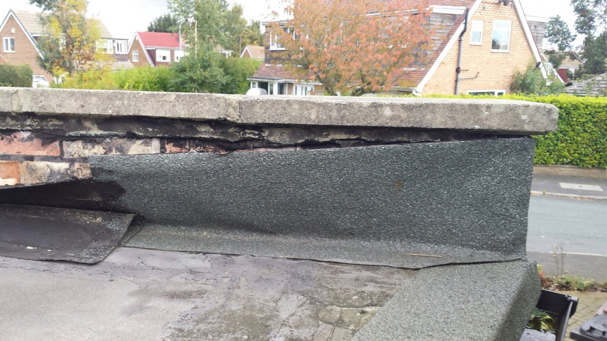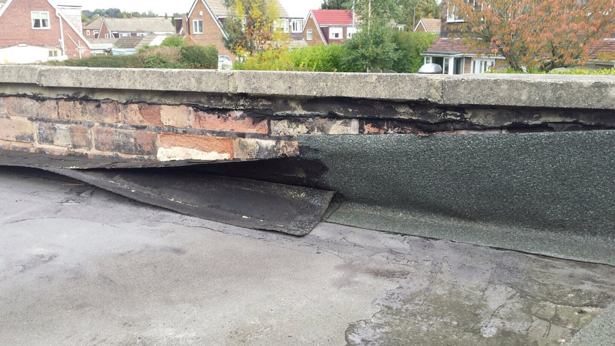 During a recent rainstorm she noticed water running down the inside of the garage door and a quick inspect of the roof revealed an obvious culprit. The felt that ran up the upstanding wall had peeled back as the attached photos show.