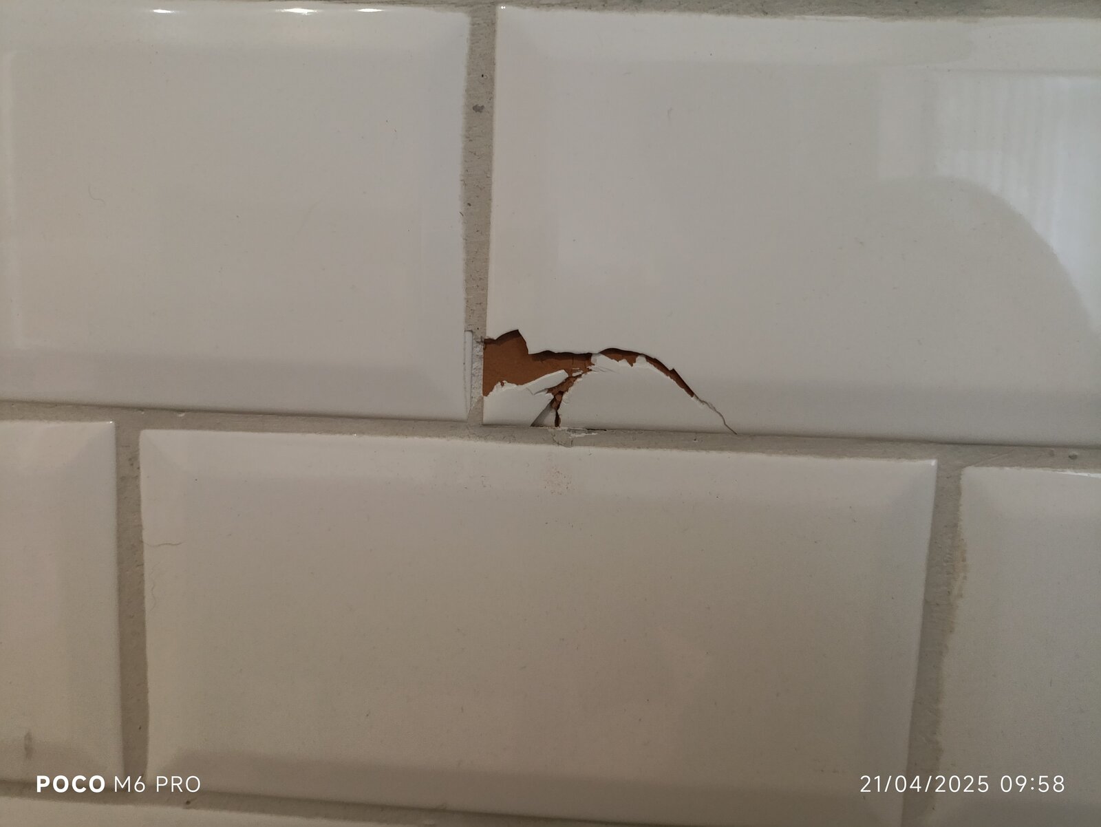 Drill a hole in the middle of the tile. Using say a plugging chisel or similar, peck away at the hole working outwards. The bits closest to the grout line will begin falling out. Go buy yourself a new white Metro tile and fix.Hi all