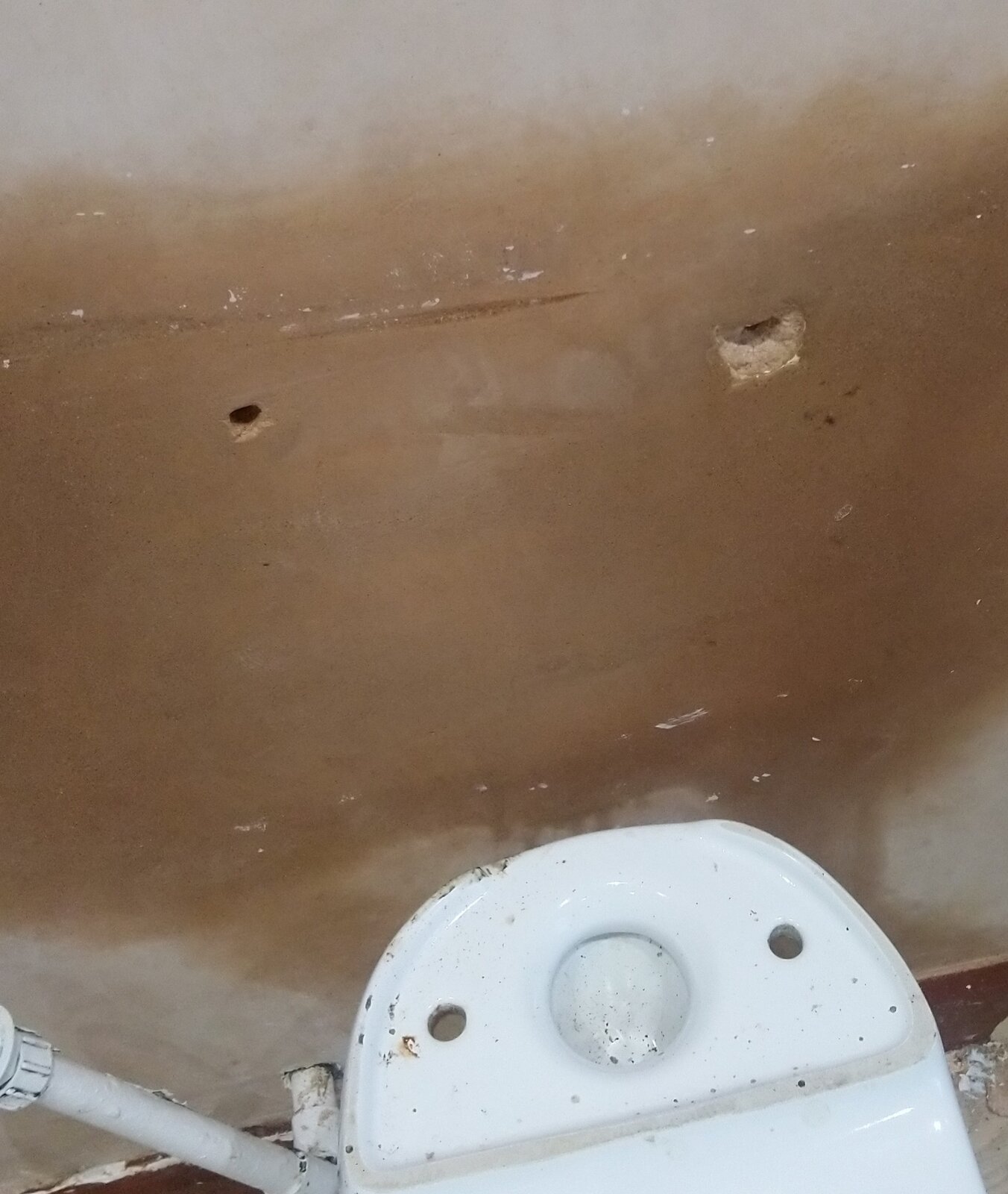 I'm stuck... I have taken the toilet cistern off the wall to repair and redecorate.... I now have 2 holes where rusted nails and wall plugs were... How can I repair and level the holes so I can fix the cistern back onto the wall securely? Note these are solid wall not plaster board.. Its an interior wall with skimmed plaster maube???? but the holes are big and there is only one position to screw em in on the cistern.. See pictures... Please help before toilet goes back on Thankyou