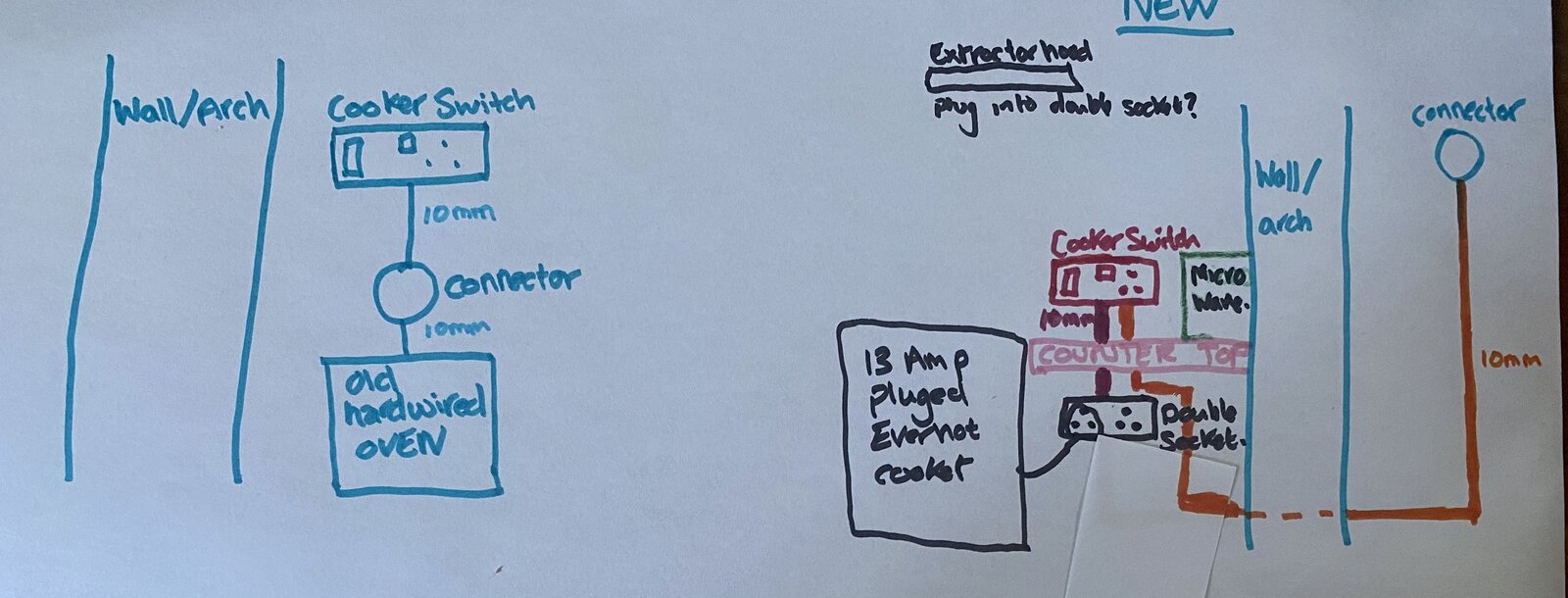 I would like advice on how to wire the extractor hood in best too? It’s floating in the diagram as not sure the best way to handle this and would like it connected to the cooker circuit if possible as no main circuit this side of the wall