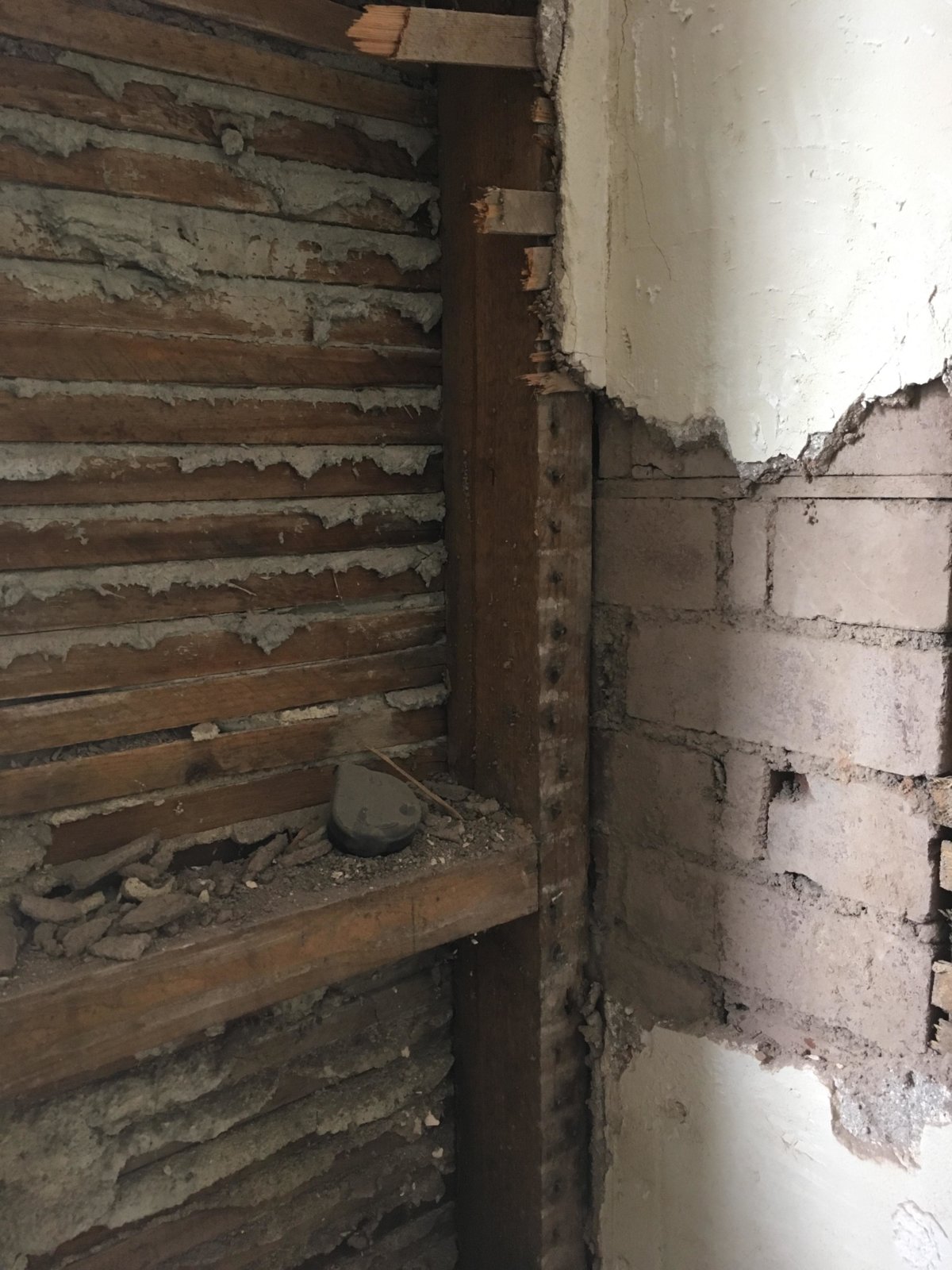 However on the first floor the external wall (only the external walls of the bathroom and separate toilet) are constructed of a timber frame placed into the surrounding brick and stone construction, with plaster and lath finish.
