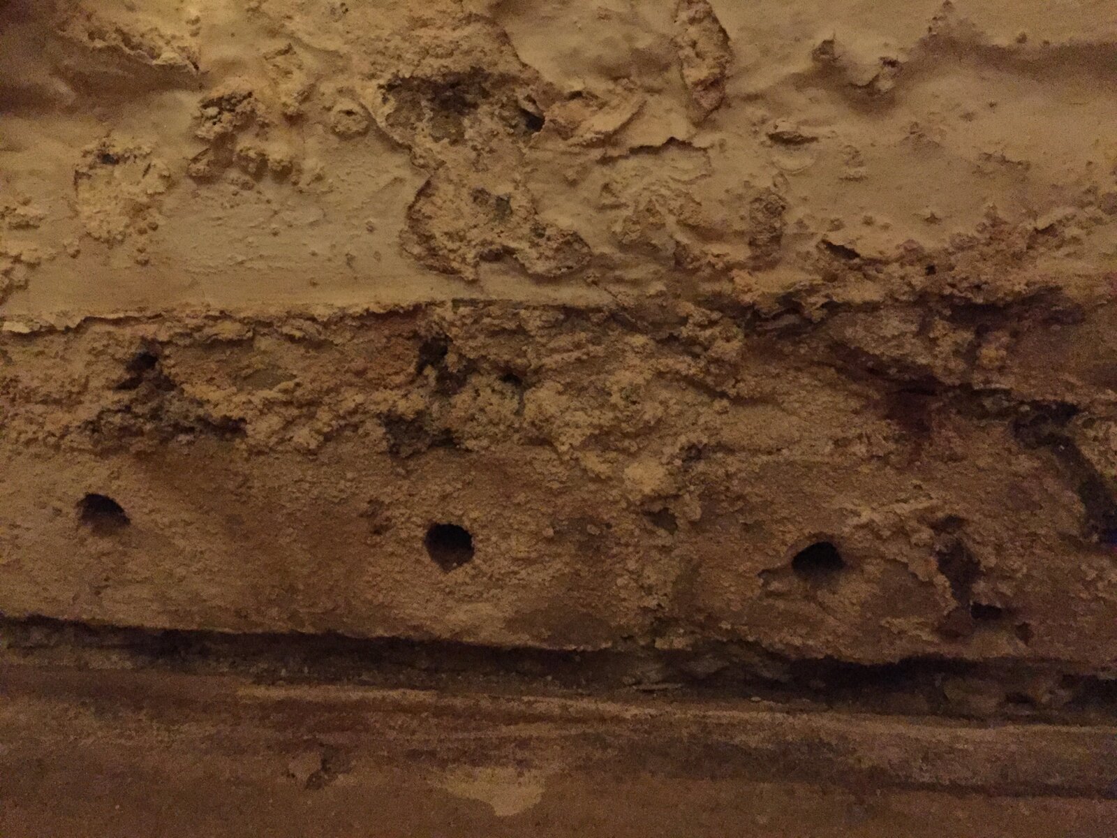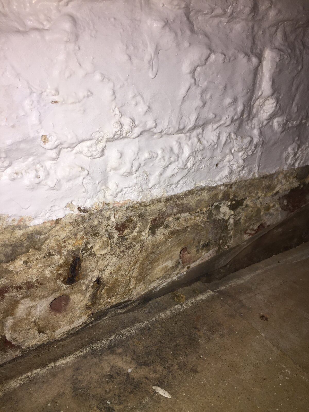 The damp surveyor reckoned the chimney flaunching at the top of the stack in our front room is faulty leading to moisture ingress which makes its way down the stack, and when it gets down, essentially migrating along the party wall and then into the brick wall. Only the bottom of the brick wall is badly damp. Attached some photos.