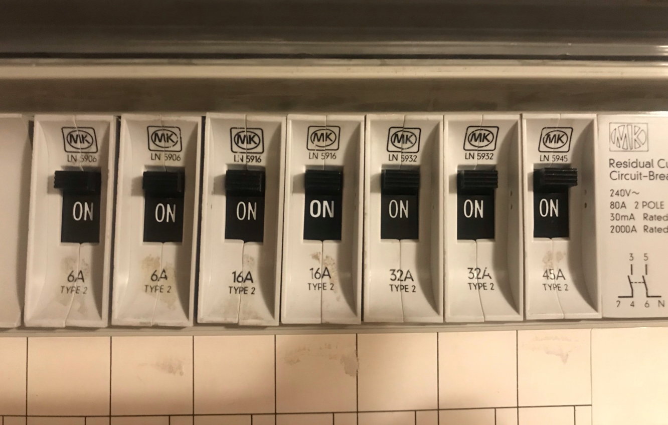 The switches in the consumer unit aren't labelled but the 6A MCB on the left turns off the light.
