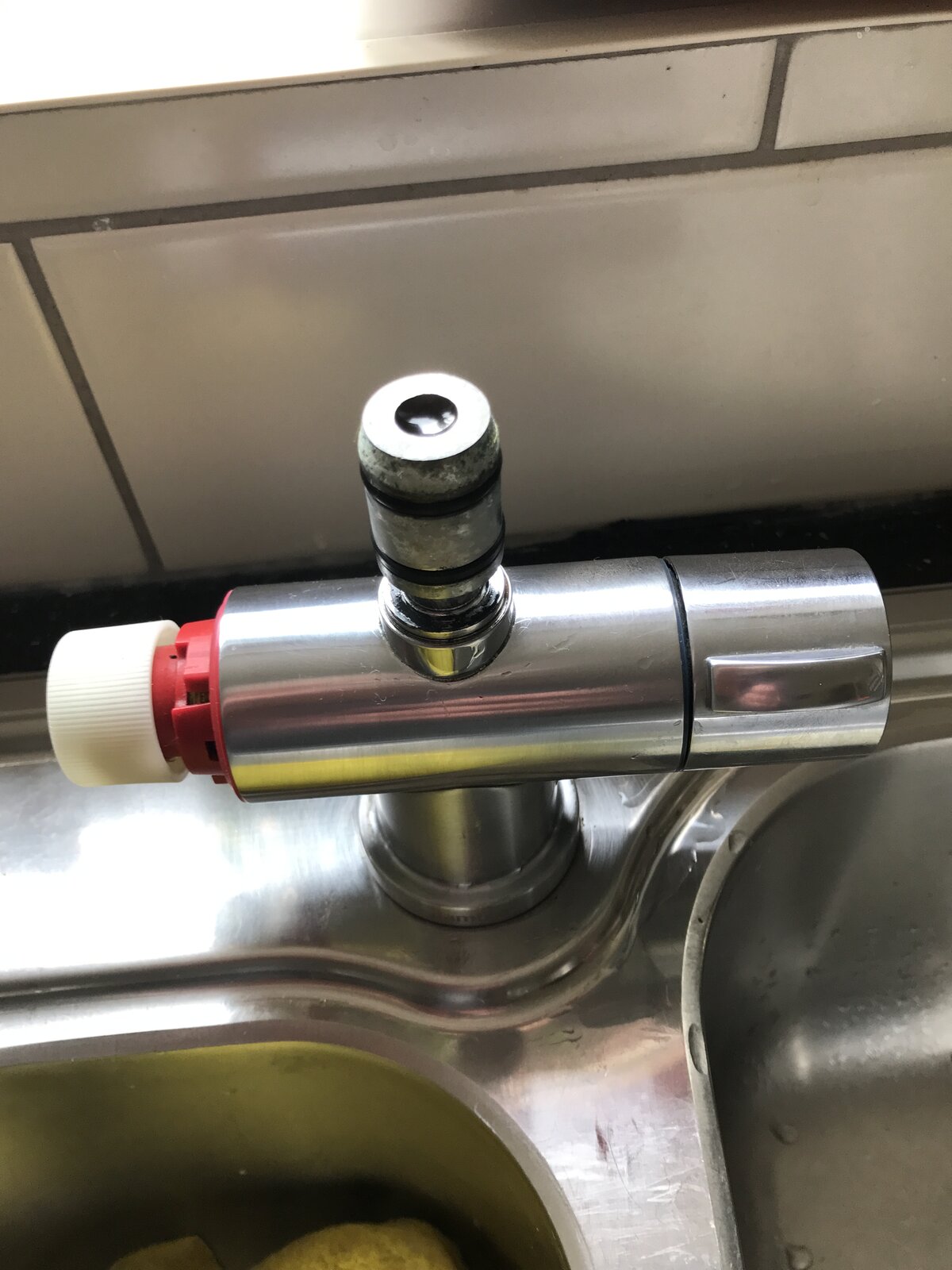 Remove the white plastic splined part (may have a screw in the centre) and the red plastic part. Should reveal a hexagonal brass nut which forms part of the cartridge. Unscrew anti-clockwise looking end on.