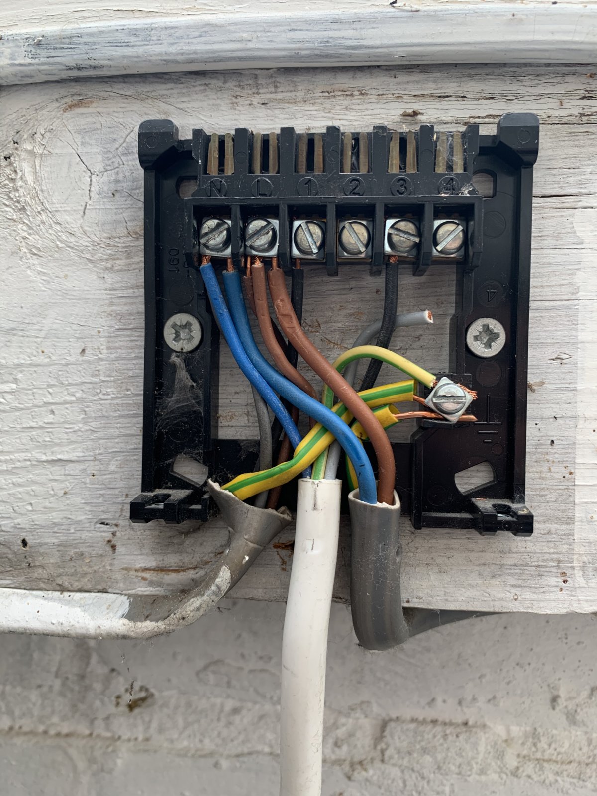 The cable to the programmer goes from L, N, 1 and earth. [grey, painted 5 core]