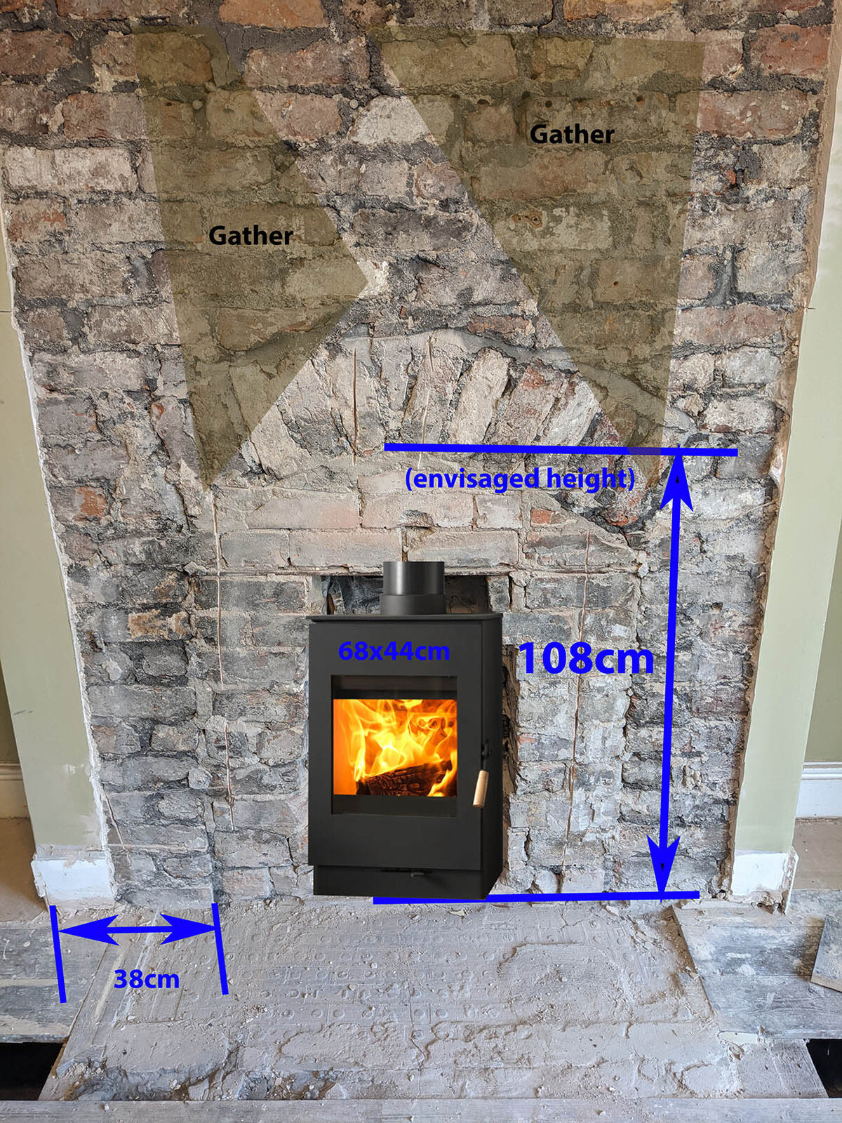I have stove with an offer too good to refuse, and hoping it will fit. Planning to get HETAS company in to fit flue liner and install appliance, but planning to do building work myself (to regs) to cut costs but mainly also part of the pleasure. In touch with Building Control.