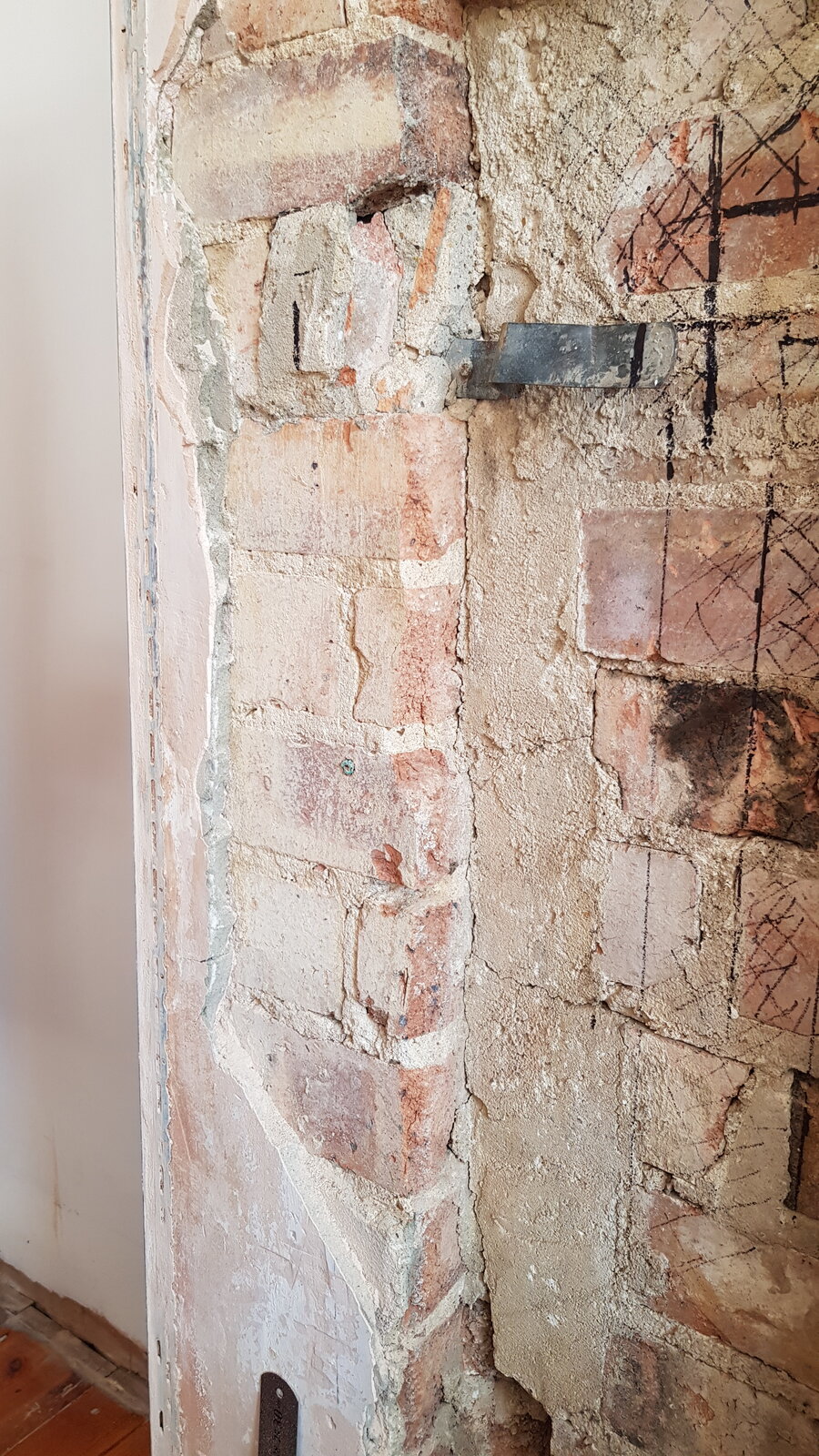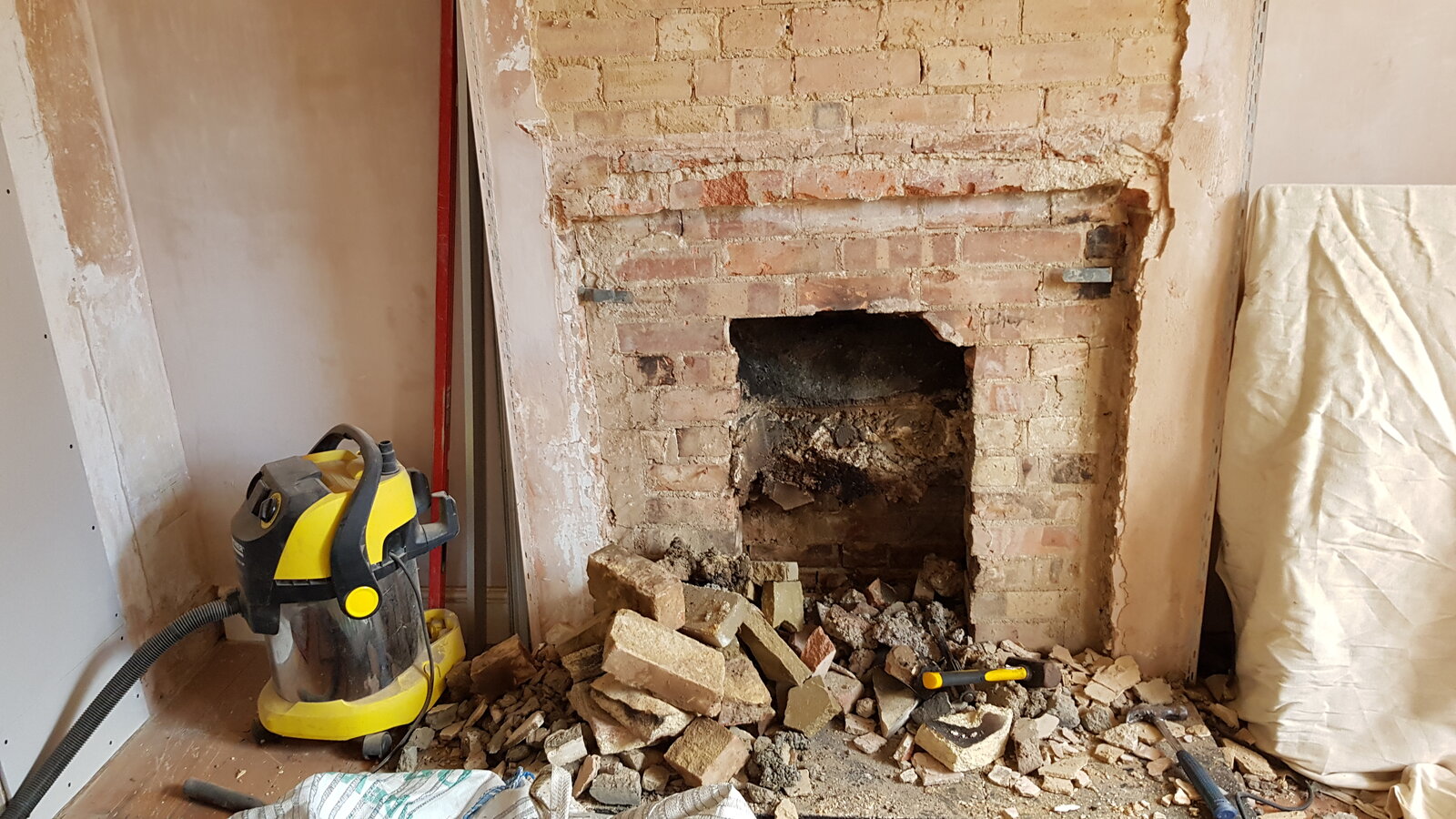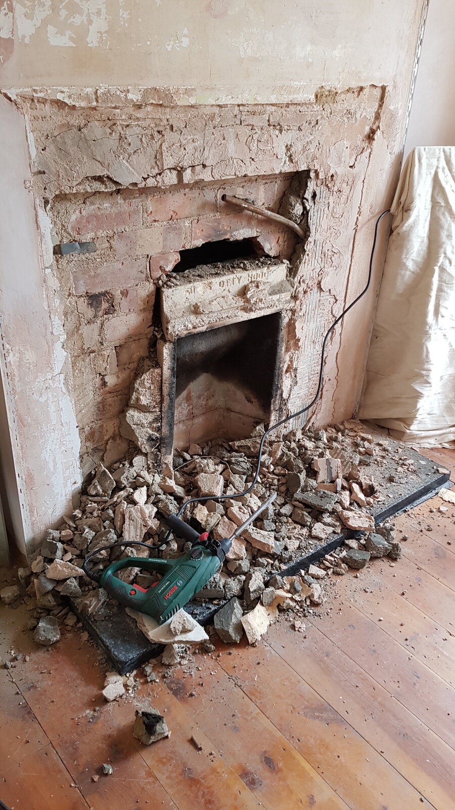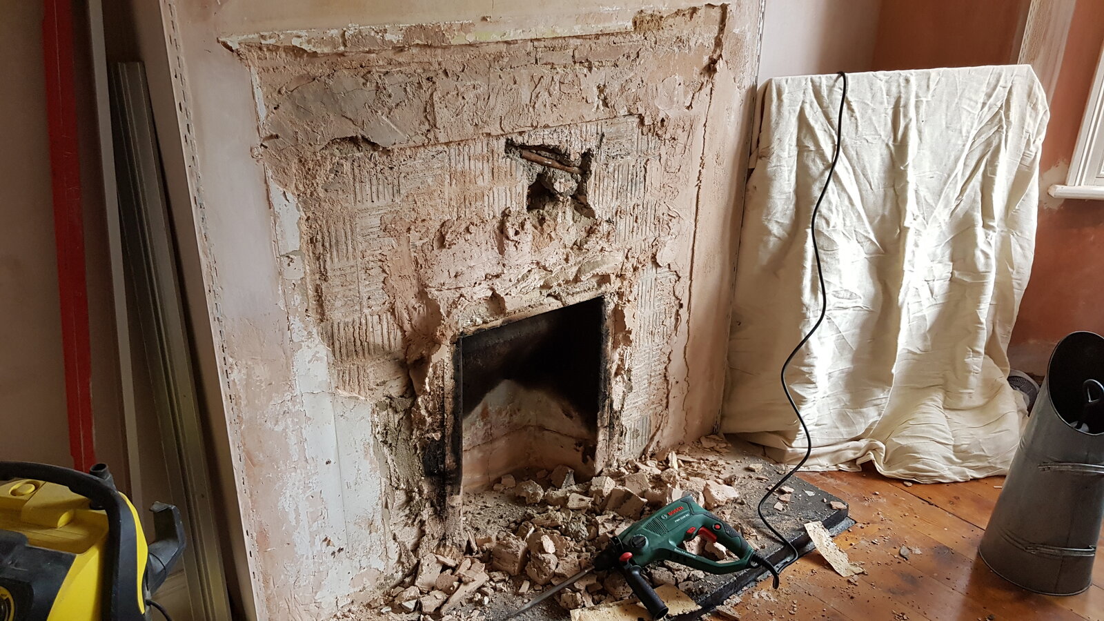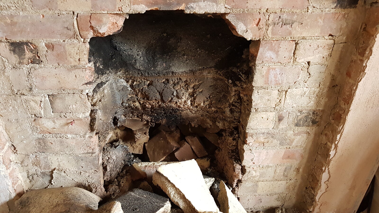 Anyway, that seems to have then been removed, and replaced with a smaller open fire. The remaining space it left has then been filled back in with a single brick skin, and faced with a layer of concrete over the skin.