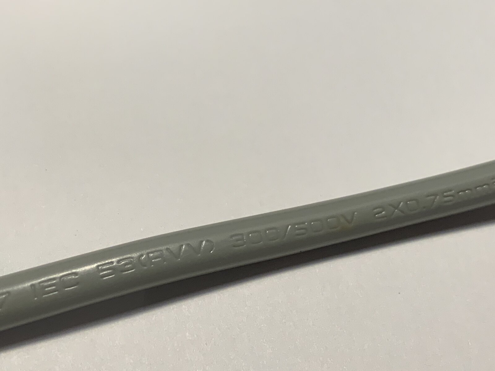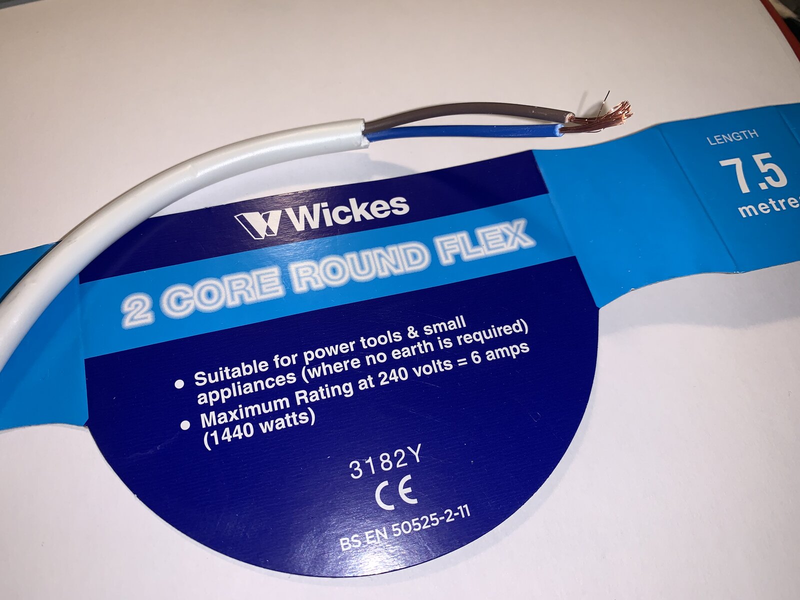 ( I chose this new flex because, just like the old one, it is 0.75 mm2 and has two cores which are blue and brown. I presume the jacket colour doesn’t matter. Label is also attached; the cooker hood model is ancient, and has modern equivalents like this)