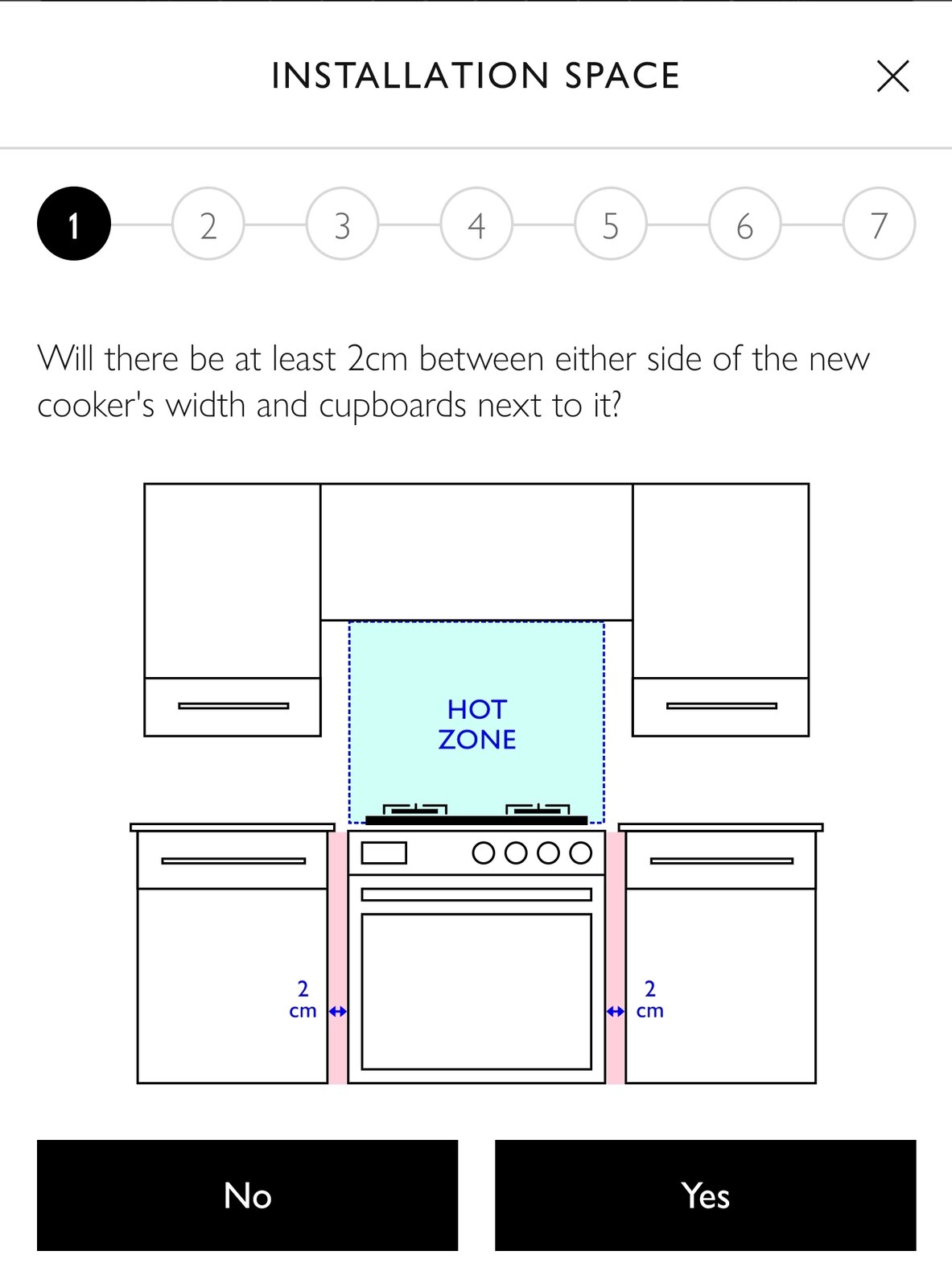 The issue I have is that although there is a 2cm gap either side of the oven, due to the layout of the kitchen, the gap on the right is actually much larger - but the counter top over hangs by a large amount, and the gap between the counter top and top of the cooker is less than 2cm.